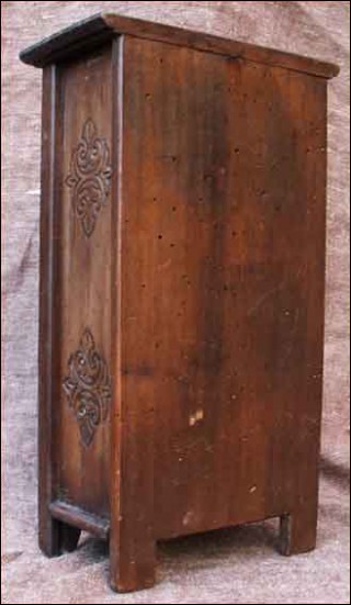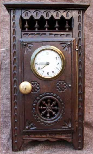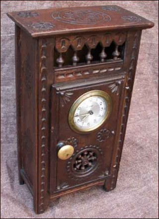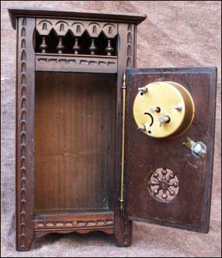 French grandfather clock for doll made in Quimper around 1900. The solid wood is hand carving and holds in the door a Scout movement in perfect condition and works well. A few small holes have been treated. Good condition. 11" high 5"1/4 width 3"1/2 depth.