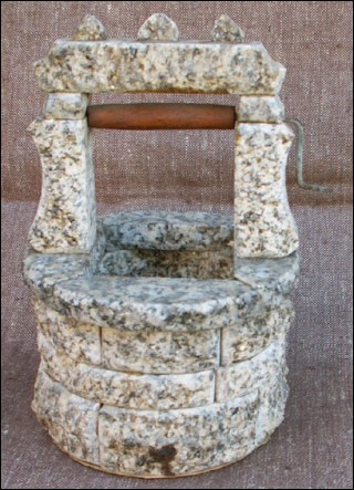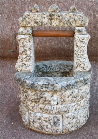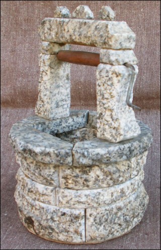 For our French-speaking friends Puit de jardin breton pour la maison de poupée en granit jaune et bleu. Très bel état. Hauteur 21 cm, diamètre 13 cm.