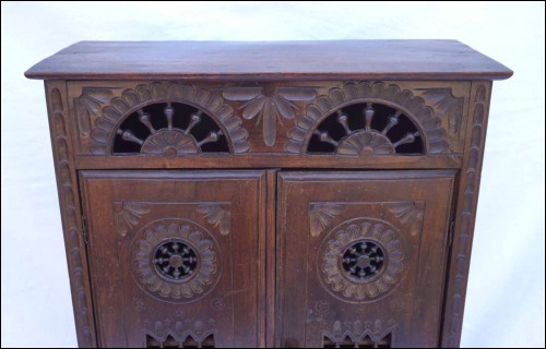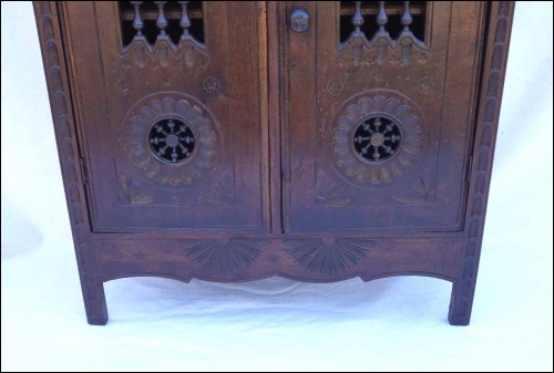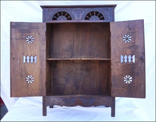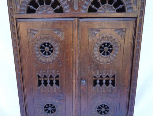 Armoire bretonne de poupée en bois sculpté et tourné, vers 1950. Hauteur 60 cm, largeur 41.5 cm, profondeur 16.8 cm. Bel état.