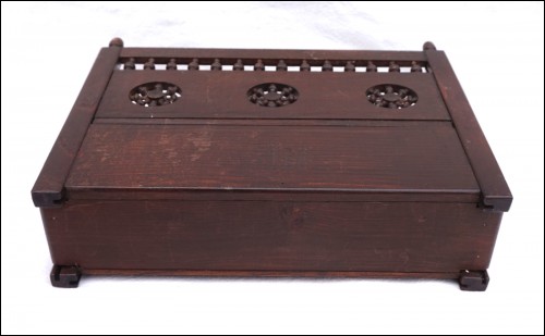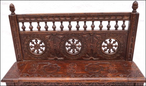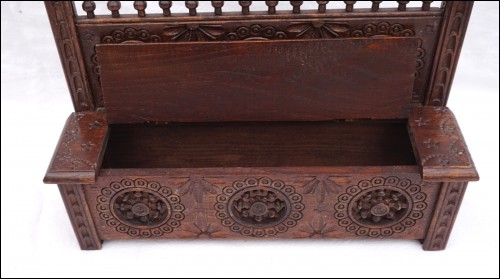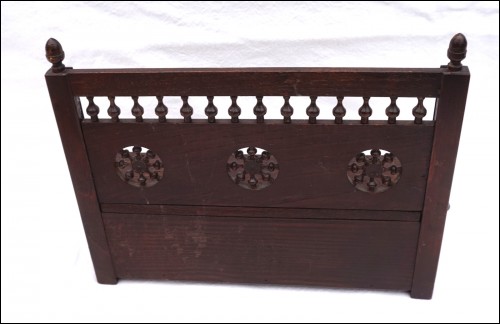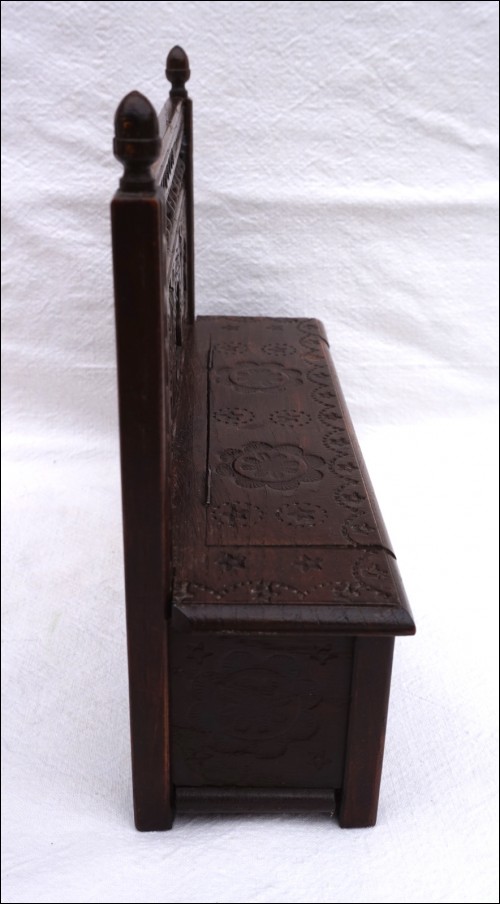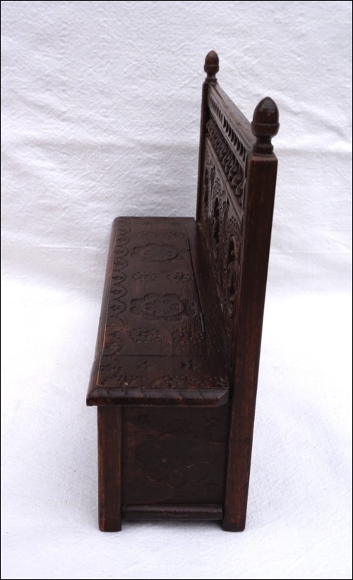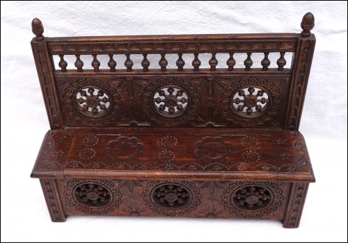 Vintage cut carved wood doll house chest bench made by Le Goff in Plozevet near Quimper during the 1960's. It's stamped on the back. 10 3/4" (27.5cm) length, 8 1/4" (21cm) height, 3" (7.7cm) width. Perfect condition as shown by the following pictures.
