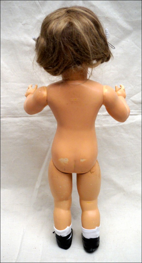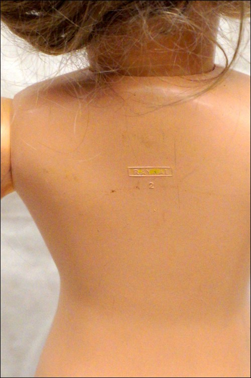 Vintage french doll with googly sleeping blue eyes made by Raynal during the 1960's. The clothes and the hair wig looks original. She is stamped on the neck and the body Raynal 2. The sound system no longer works. 22 3/8" high.