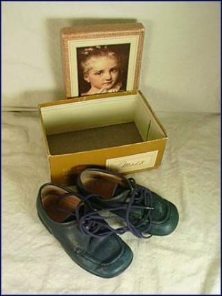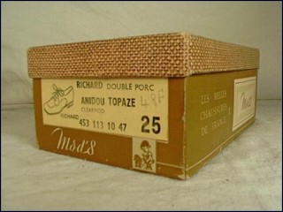 Here are a pair of 1950's kid baby shoes. They are in very good condition with minor scuffs. The box has a price label from Mod'8 made in France Rue de la Paix à Paris for 48 Fr and is in good condition. I don't know if this is the original box.