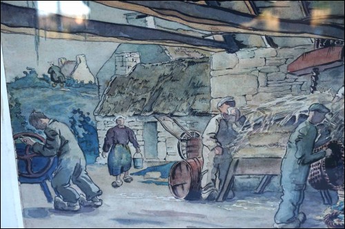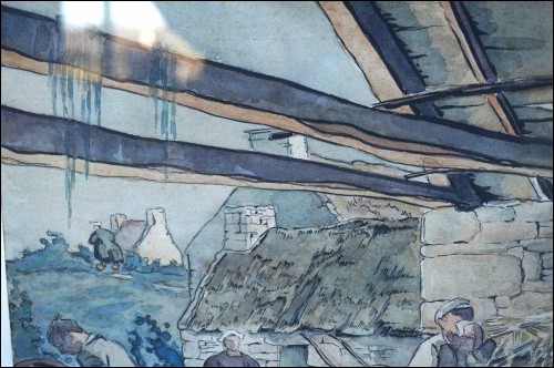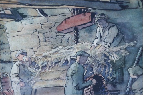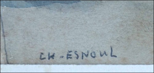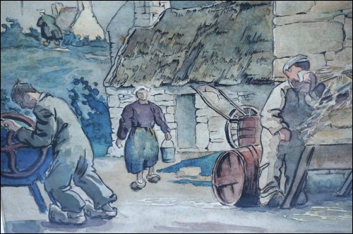 Cider making scratting and pressing, framed watercolor made by Charles Esnoul (1910-1989) in Brittany during the mid-century. It measures for the frame: 23" (58.5cm) by 18 7/8" (48cm), for the view 15 3/4" (39.8cm) by 11" (27.8cm). Perfect condition as shown by the following pictures.