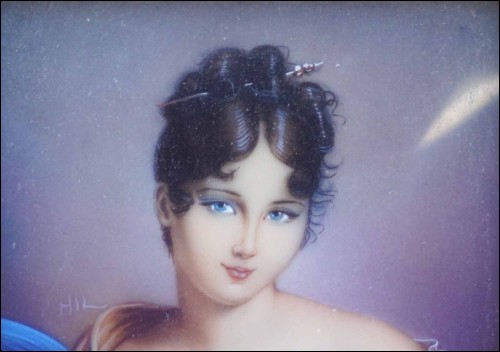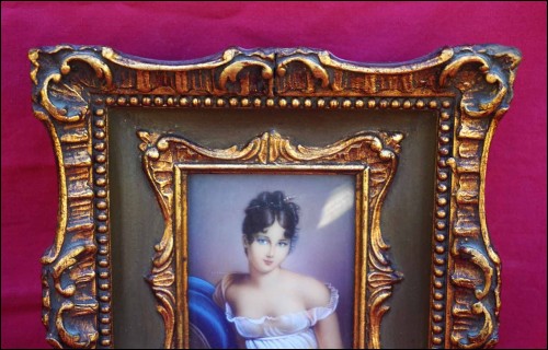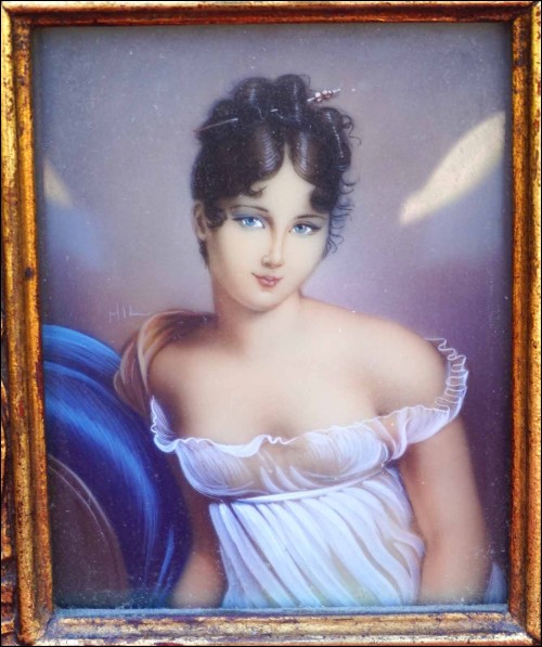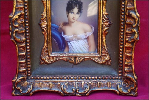 Juliette Recamier french framed hand painted miniature signed HIL made during the mid-cenury. 6 3/4" (17.2cm) by 7 1/2" (19cm) for the frame and 3 1/4" (8.2cm) by 2 1/2" (6.4cm) for the miniature view, weight 12.02oz (341 grams). Perfect condition as shown by the following pictures.