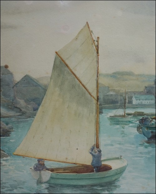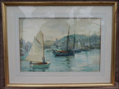 Sealing boats in the Massa Carrara harbor (Italy) watercolor by Arthur George Wallis (born 1862) english seascape and landscape artist. The framed watercolor is signed on the bottom right corner AG Wallis. Good condition a few tiny yellowish as presented on the following pictures. The picture measures 21 1/4" width 14 1/8" height.