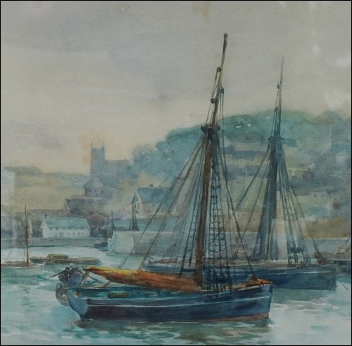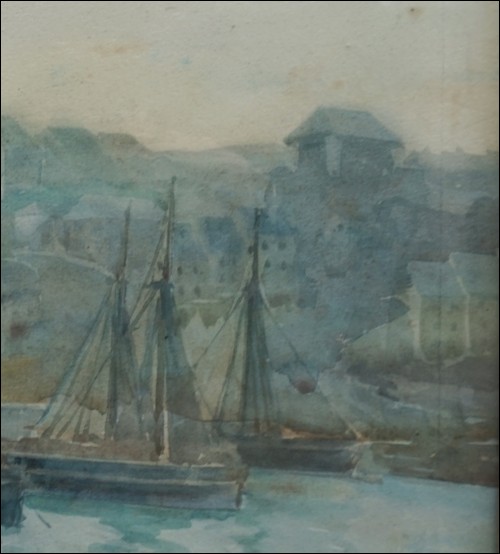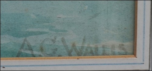 Port de Massa Carrara (Italie) marine peinte à l'aquarelle sur papier, fin XIXème, signée en bas à droite AG Wallis, pour Arthur George Wallis (1862-) Anglais peintre de paysage. Encadré sous verre, bel état, quelques rousseurs, pour la vue : hauteur 36 cm, largueur 54 cm.