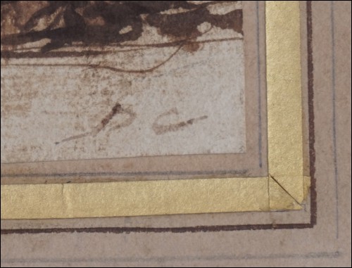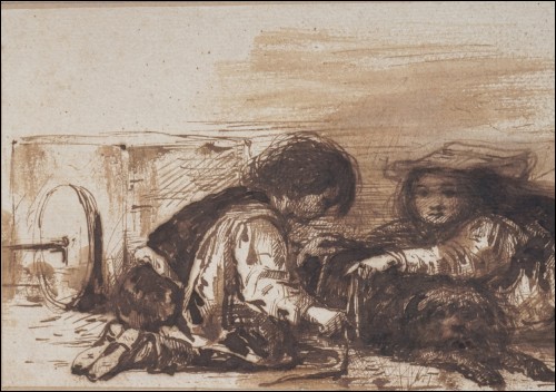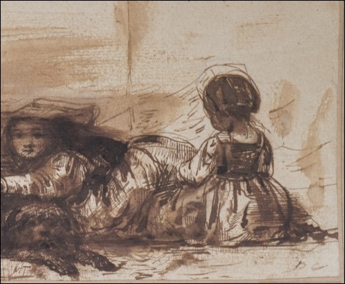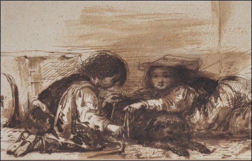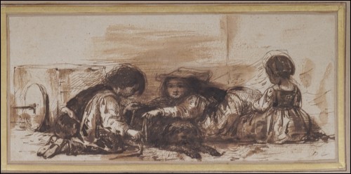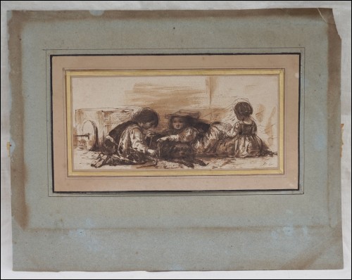 Dessin au lavis de Alexandre-Gabriel Decamps, peintre orientaliste, 1803-1860. Enfants d'Italie du Sud: l'attelage du chien. Original monogramme DC souvent utilisé par l'artiste. Bel état pour le dessin. Hauteur 10 cm, largeur 22 cm.