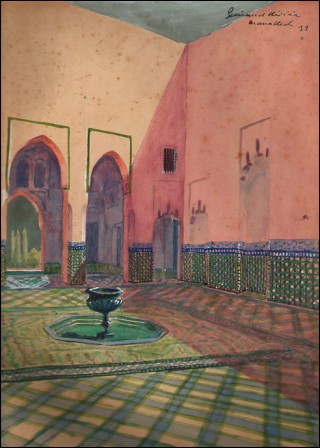 French orientalist watercolor painting made by the famous Guiraud Riviere artist during his travel in Morocco in 1933 showing the inside of house in Marrakesh.12"1/4 by 8"1/2.Signed and dated on the right top corner. Origin: private collection of the daughter's artist.