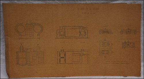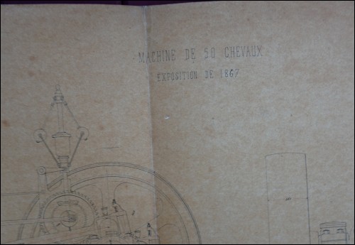 For our French-speaking friends Exposition Universelle de Paris 1867, projet de Machine de 50 chevaux, projet en coupe et élévation plan avec rajouts de cylindre condensateur boite de distribution de la machine de Mrs Houget et Teston de Verviers. Hauteur 62,5 cm, largeur 93 cm et hauteur 38,5 cm, largeur 71cm. Provenance: Fond de Mr François Prosper Jacqmin (1820-1889), Polytechnicien, ingénieur au corps Impérial des Pont et Chaussées, professeur et président de l'école, et membre du Jury,Classe 52, de l'Exposition Universelle Internationale de 1867. Bel état, papier jauni, petits accrocs sur les bords.