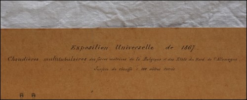 Exposition Universelle de Paris 1867, projet en coupe d'une chaudière multitubulaire des forces motrices de la Belgique et des Etats du Nord de l'Allemagne. Surface chauffée 100 mètres carrés, tubage Berendorff. Hauteur 39cm, largeur 67.5cm. Provenance: Fond de Mr François Prosper Jacqmin (1820-1889), Polytechnicien, ingénieur au corps Impérial des Pont et Chaussées, professeur et président de l'école, et membre du Jury,Classe 52, de l'Exposition Universelle Internationale de 1867.Provenance: Fond de Mr François Prosper Jacqmin (1820-1889), Polytechnicien, ingénieur au corps Impérial des Pont et Chaussées, professeur et président de l'école, et membre du Jury,Classe 52, de l'Exposition Universelle Internationale de 1867. Bel état, angles coupés.