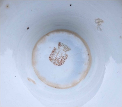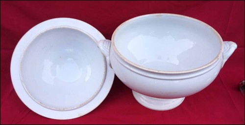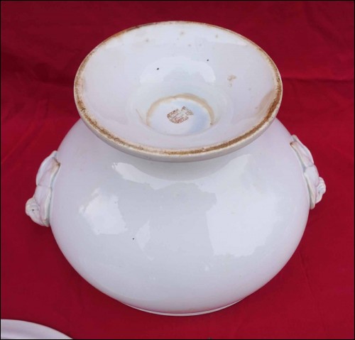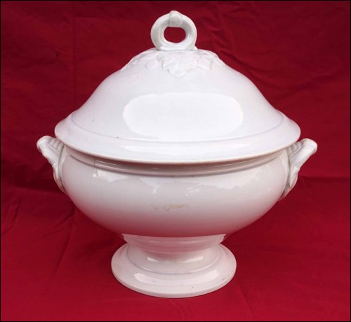 French white half porcelain tureen with loop handle and leaves and fruits in relief made by Gien late 19th century. It's stamped and numbered on the back. 12 5/8" (32cm) height, 11" (28cm) diameter, 13" (33cm) width with the handles, weight 6lb 5,44oz (2,876 kilograms). Good condition a few small stains as shown by the following pictures.