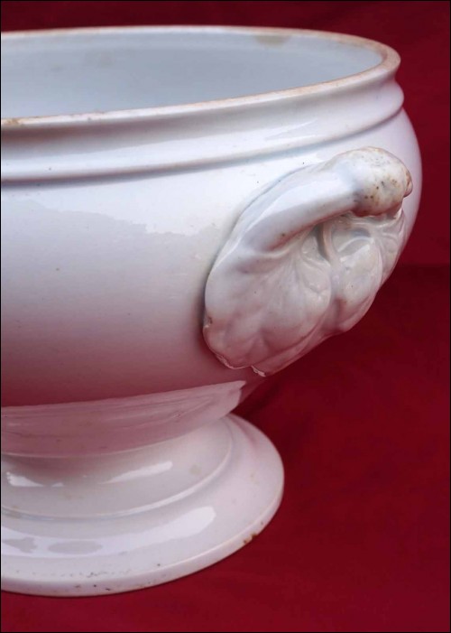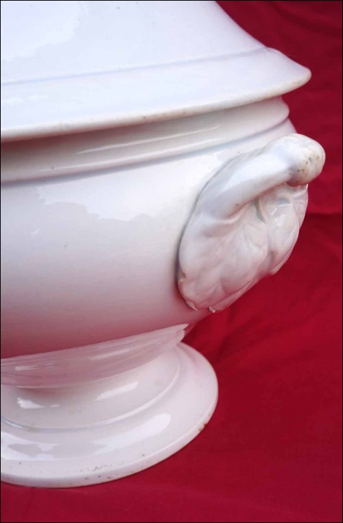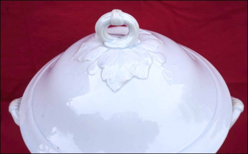 Soupière en porcelaine opaque blanche ornée de feuillages et fruit par Gien, deuxième moitié du XIX° siècle. Elle est signée sur son fond. Hauteur 32 cm, diamètre 28 cm, largeur avec les anses 33cm. Très bel état, quelques taches.