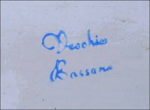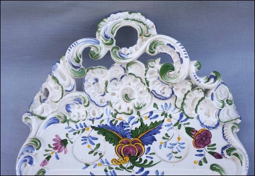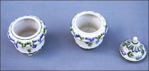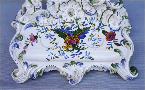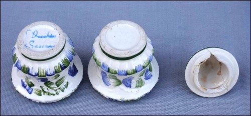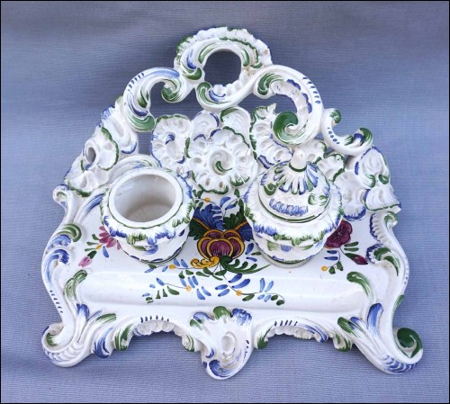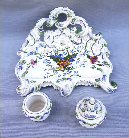Italian pottery hand painted majolica inkwell set , pencil inkwell stand and 2 lidded inkwells, in Louis XV style made by Deschies? Bassano Italy. They are signed on the back. The stand measures 10 1/2" (26.7cm) width, 4 1/4" (10.8cm) height, 8 1/4" (21cm) depth. Perfect condition for the stand, one inkwell lid is missing and the other inkwell has hairlines and chips on the lid as shown by the following pictures.
