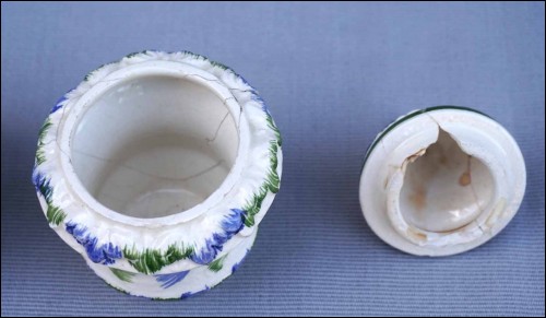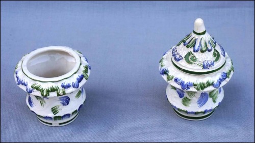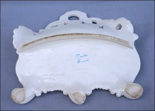 Encrier en barbotine de Bassano Italie, première moitié du XXe siècle. Les pièces sont signées sur leurs fonds. Hauteur 10.8 cm, largeur 26.7 cm, profondeur 21 cm. Bon état, manque un couvercle, le deuxième encrier cheveu sur le pot et casse sur le couvercle.