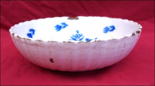 Blue White French Hand Painted Faience Ribbed Salad Bowl Cornflower Cornucopia Lille 19th C