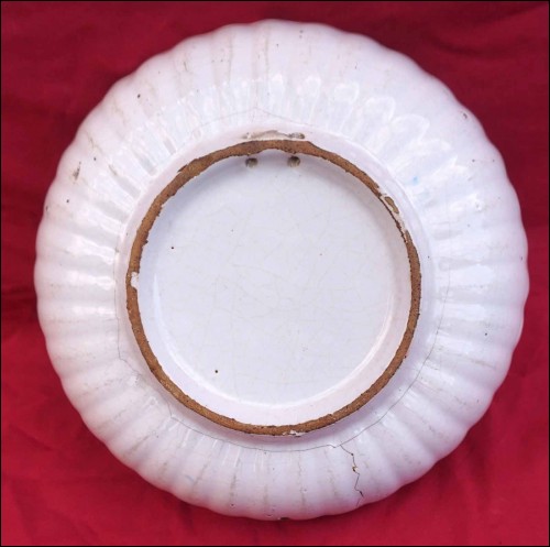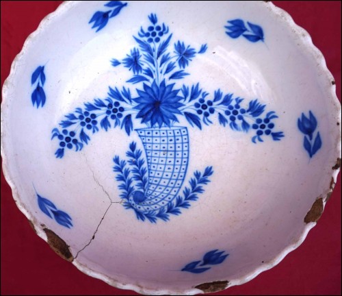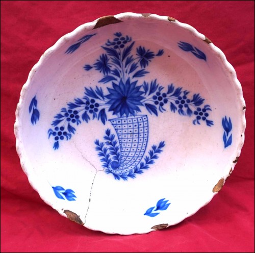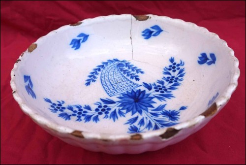 French blue and white hand painted faience showing cornucopia with cornflowers made probably Lille during the 19th century. 9 1/4" (23.3cm) diameter, 2 5/8" (6.7cm) height. Chips on the edge and one hairline as shown by the following pictures.