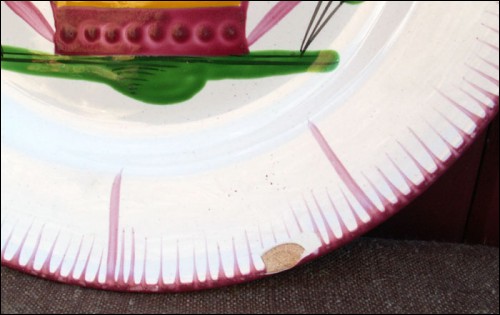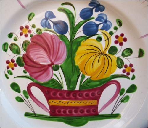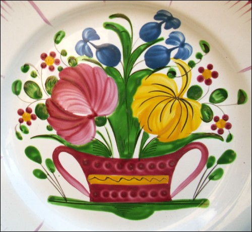 Decorative plate in french faience with hand painted bunch of flowers in a basket made by St Clement or Luneville factory eastern of France during the end of the 19th century. Good condition only a chip on the edge as you can see on the pictures below. 9 1/4" diameter.
