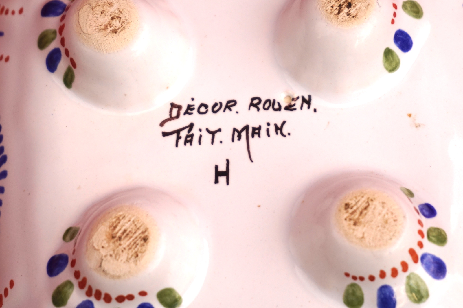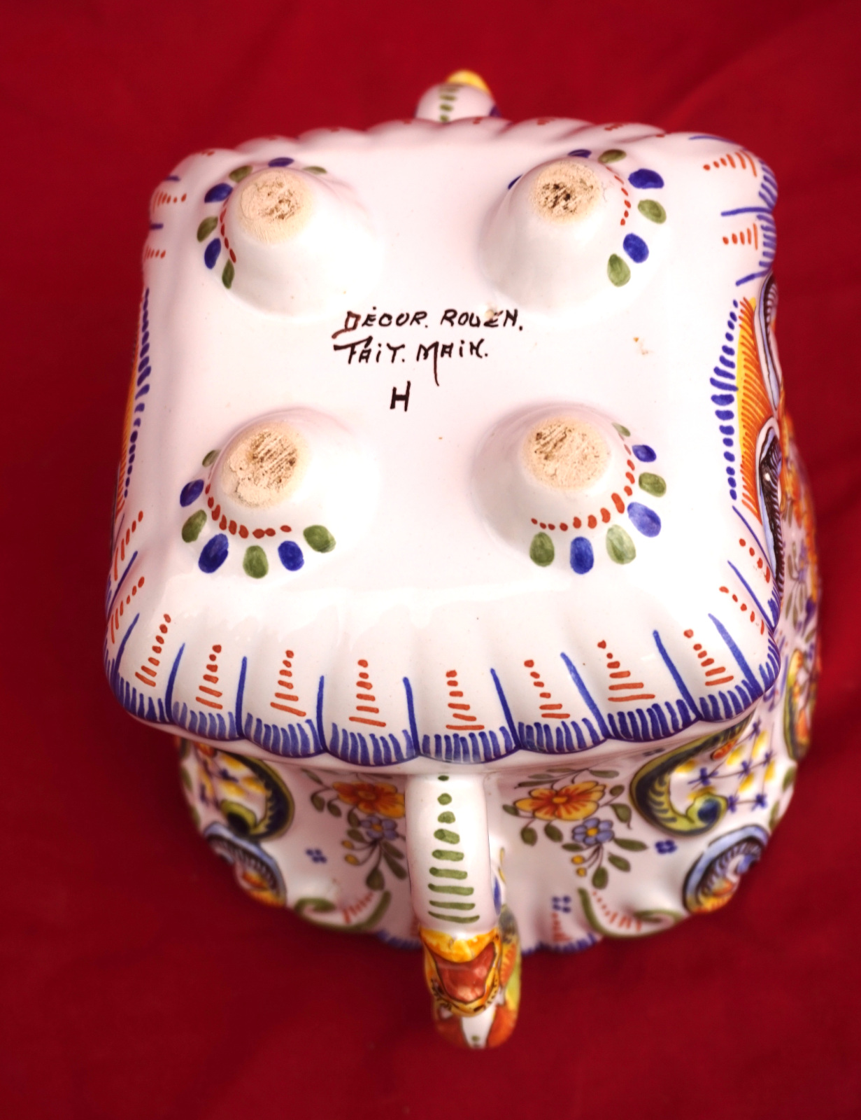 French hand painted faience with Rouen decor made by Desvres early 20th century. It's signed on the back. 7 1/2" (19cm) width with handles by 5 1/4" (13.5cm), 5 1/8" (13cm) height. Perfect condition as shown by the following pictures.