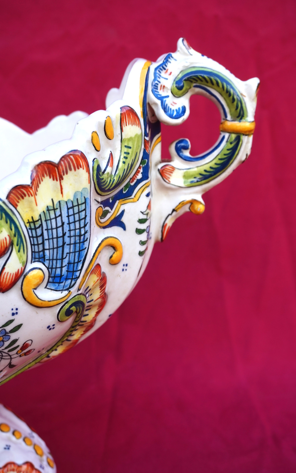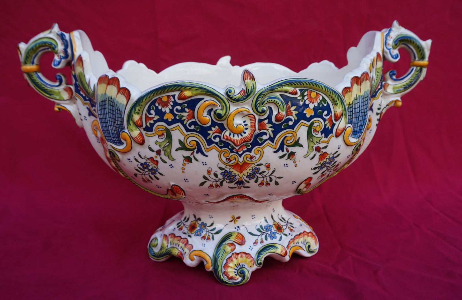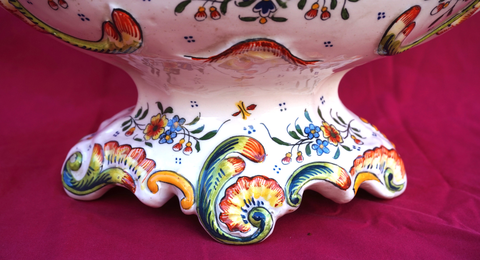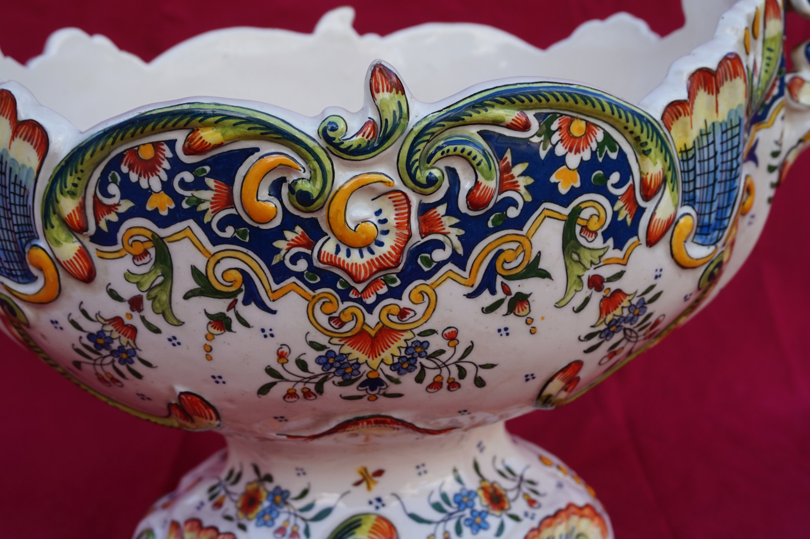 Jardinière ovale en faience peinte à la main d'un décor inspiré de Rouen, par Fourmaintraux Frères (1879-1887) à Desvres. Elle est signée sur son fond Largeur 38cm, profondeur 18cm, hauteur 23cm. Parfait état.