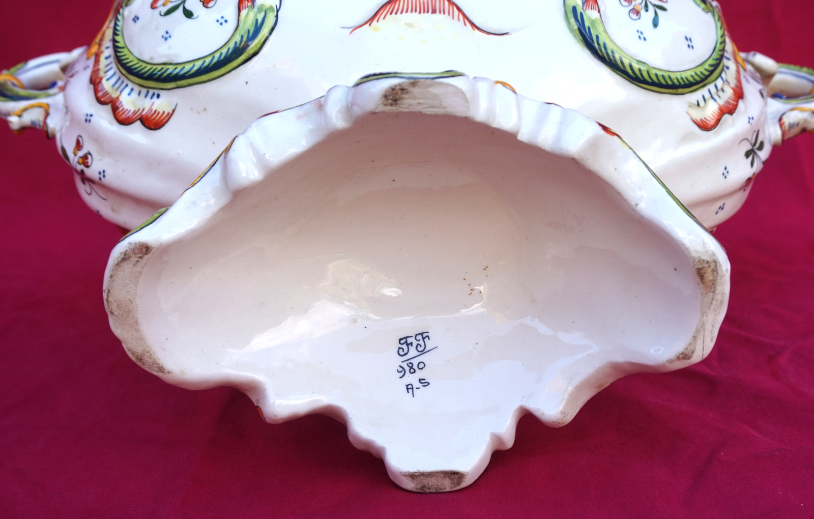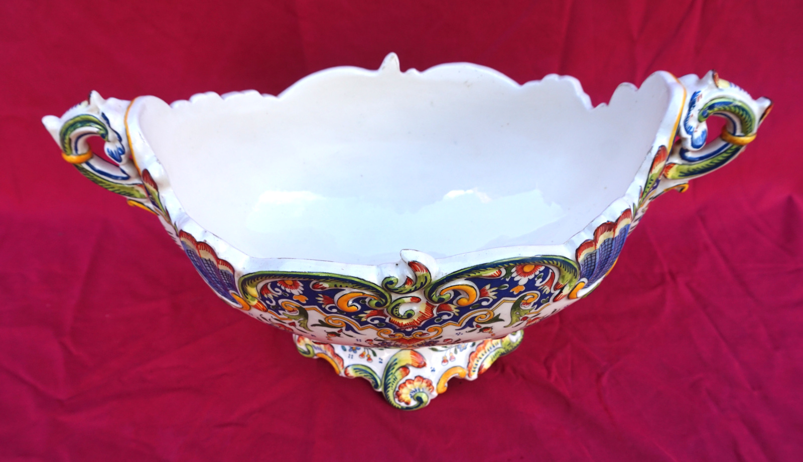 French hand painted faience oval jardiniere with Rouen decor made by Fourmaintraux Frères (1879-1887) in Desvres late 19th century . It's signed on the back. 15" (38cm) width, 7 1/8" (18cm) depth, 9" (23cm) height. Perfect condition.