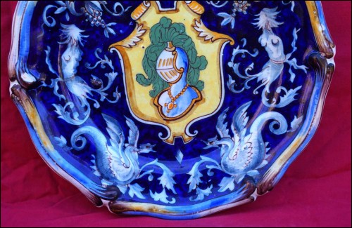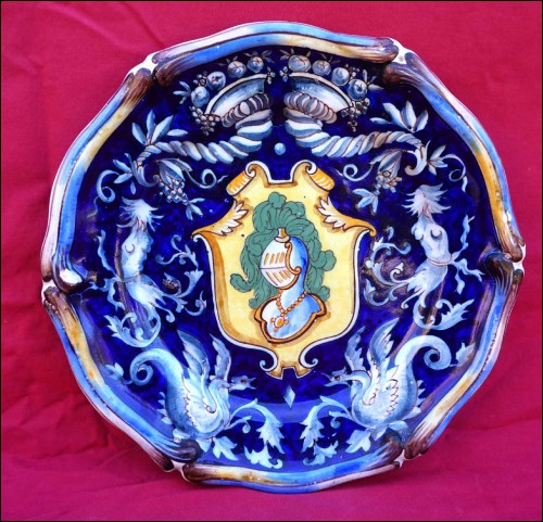 French hand painted faience scalloped plate with coat of arms of knight in medallion surrounded by dark blue border with cornucopia and chimera late 19th century. 10" (25.4cm) diameter. Perfect condition as shown by the following pictures.