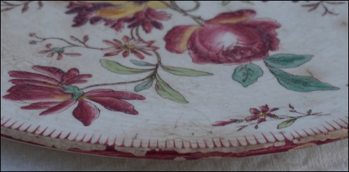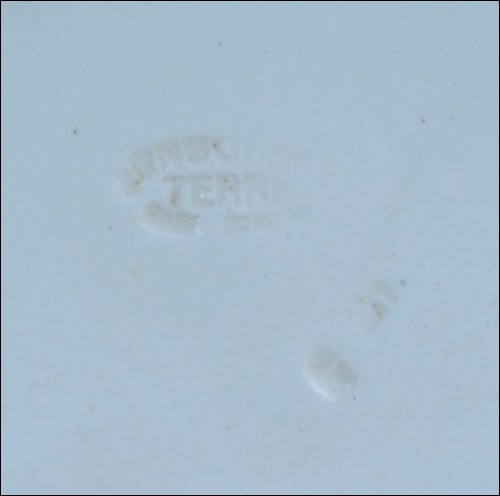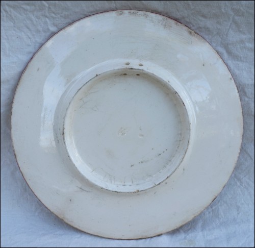 French transferware fiance decorative dish made by Longchamp during the 1910's. It stamped on the back and has 2 holes for hanging. 10 1/8" diameter. Condition, chips on the edge and heat spots as presented on the following pictures.