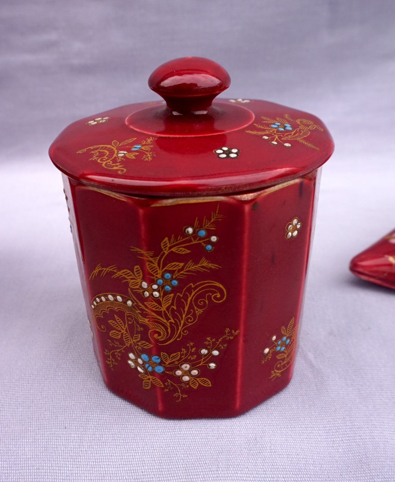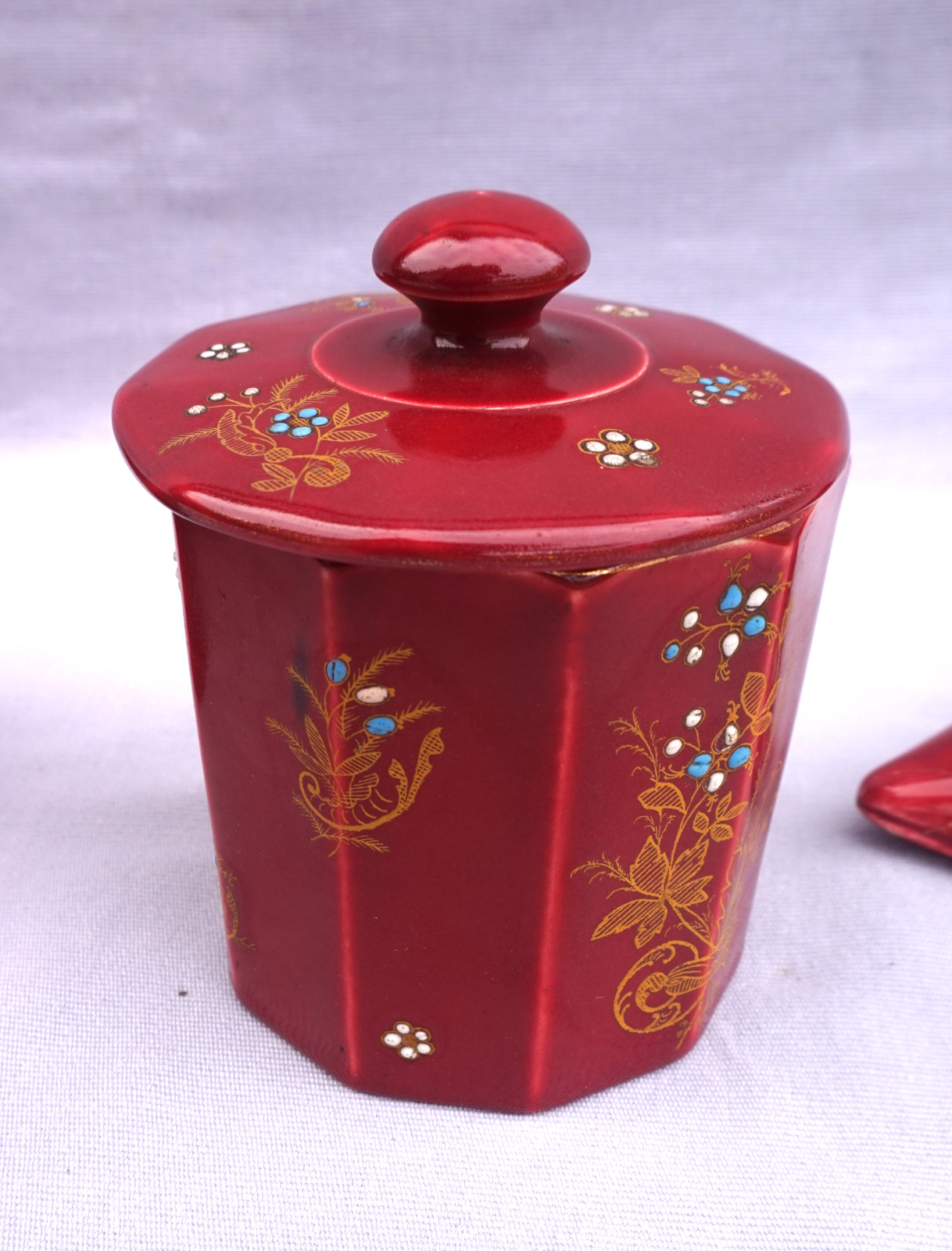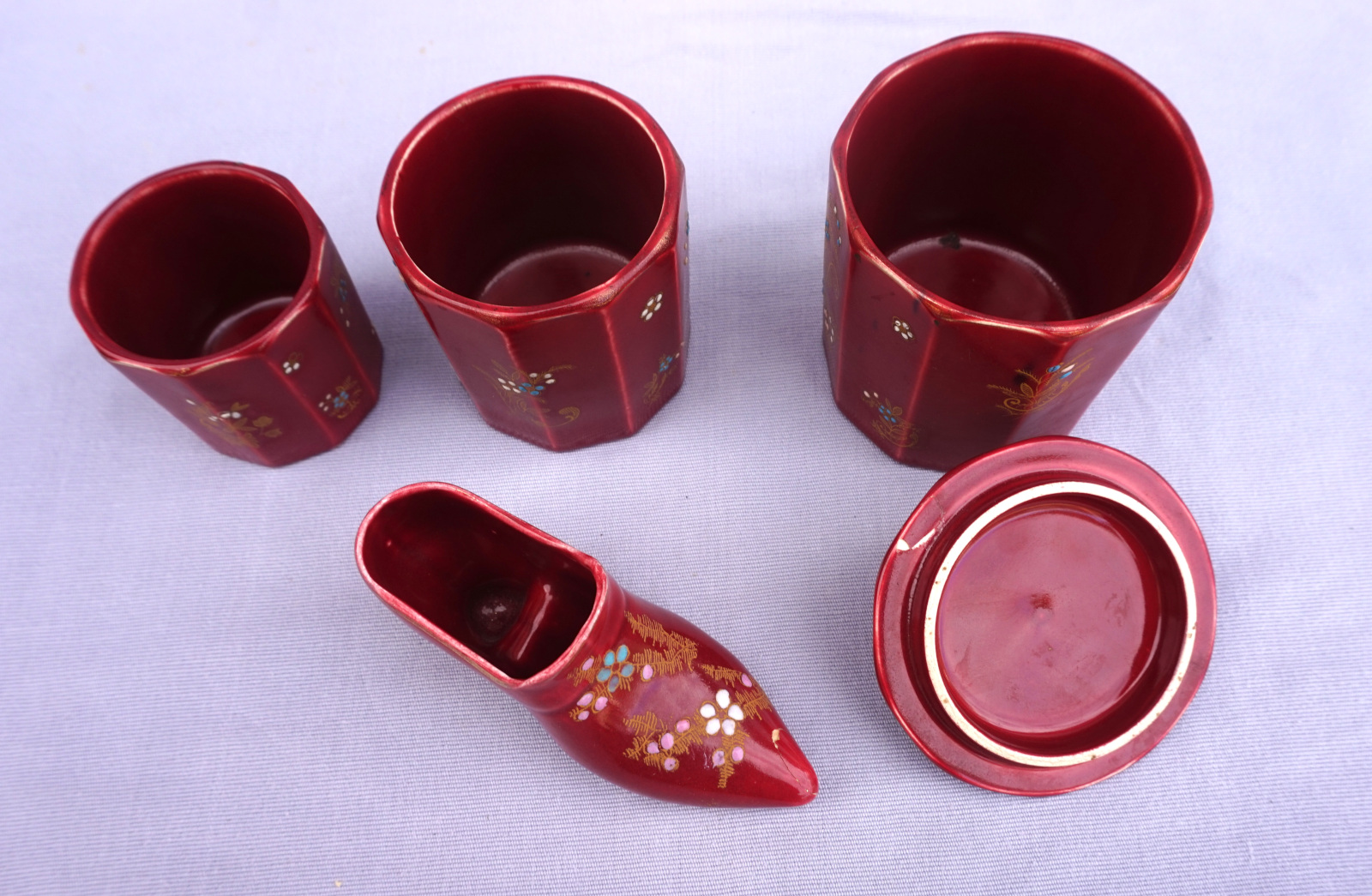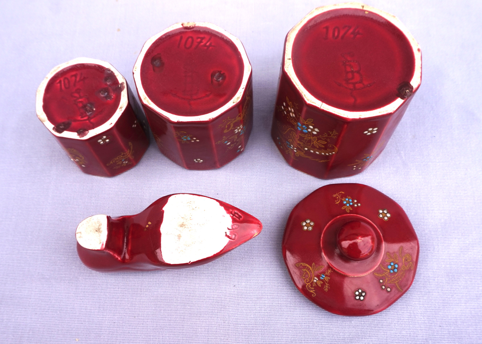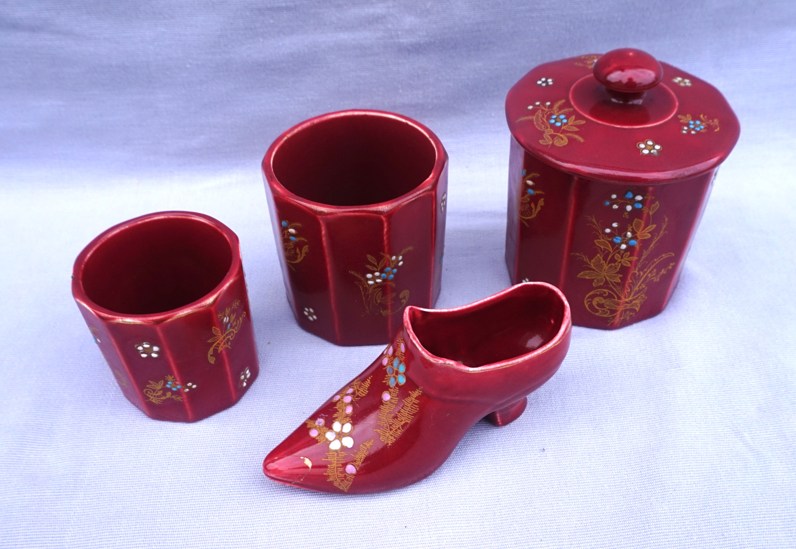 French hand enameled faience tobacco set including lidded jar, 2 pots and shose made by De Bruyn in Fives Lille during the 1900's. Signed on the back. They measures: for the lidded jar 4 1/4" (10.8cm) height diameter 3 3/4" (9.5cm) diameter, for the 2 pot 2 1/2" (6.3cm) and 3" (7.7cm) height, 2 1/2" (6.3cm) and 3" (7.7cm) diameter, for the shoe 5 1/8" (13cm) length. Good condition one repair on the back of the lid and on the end of the shose.