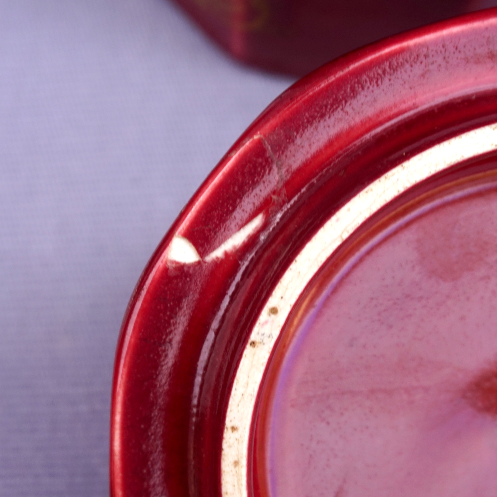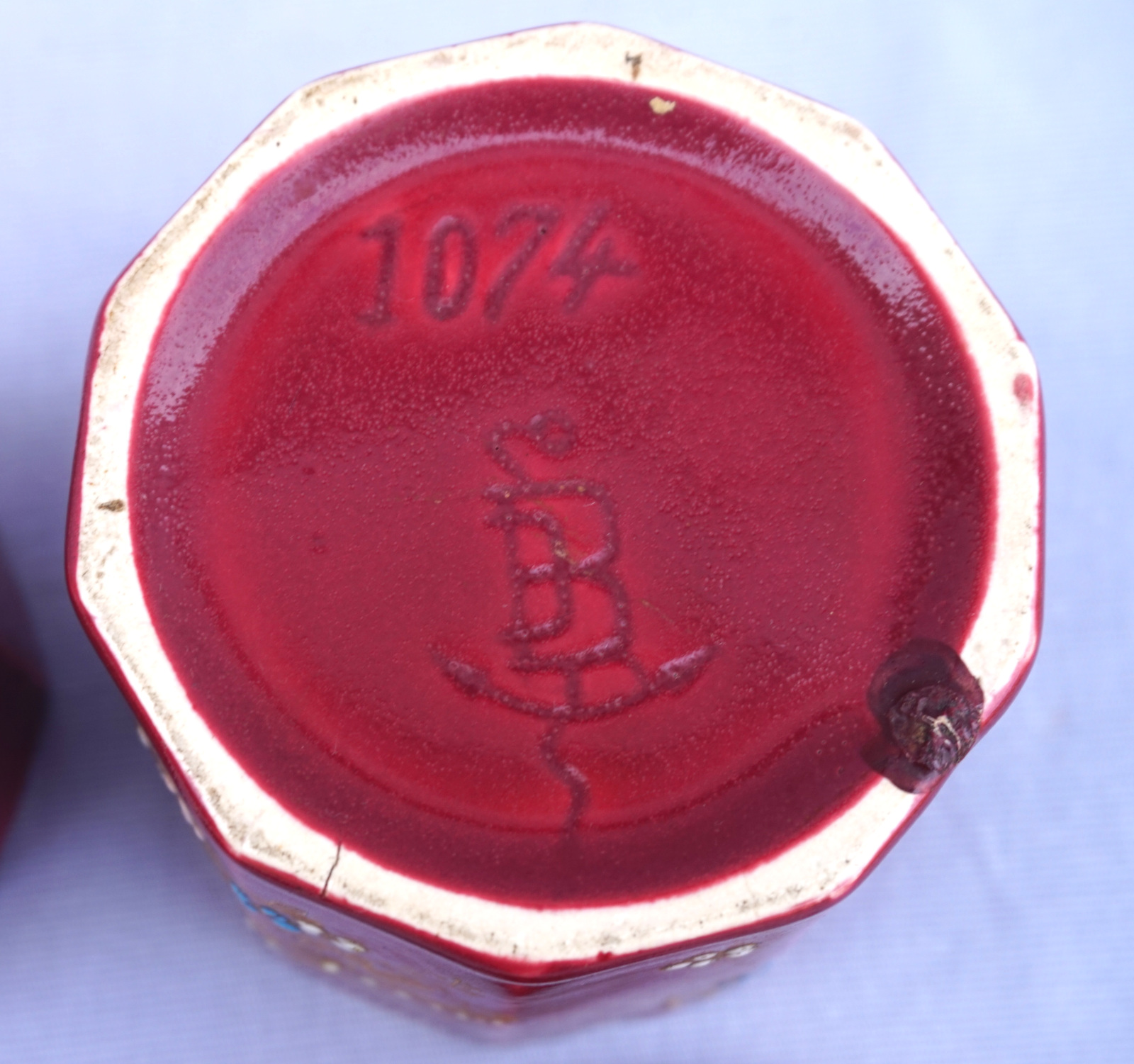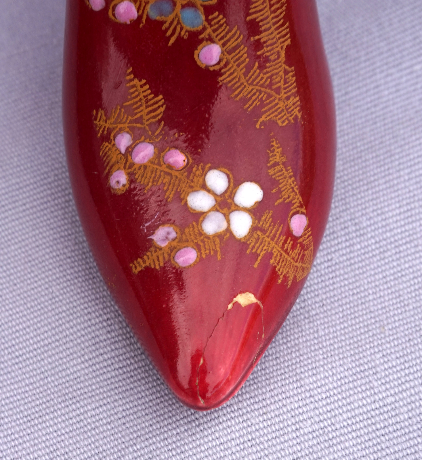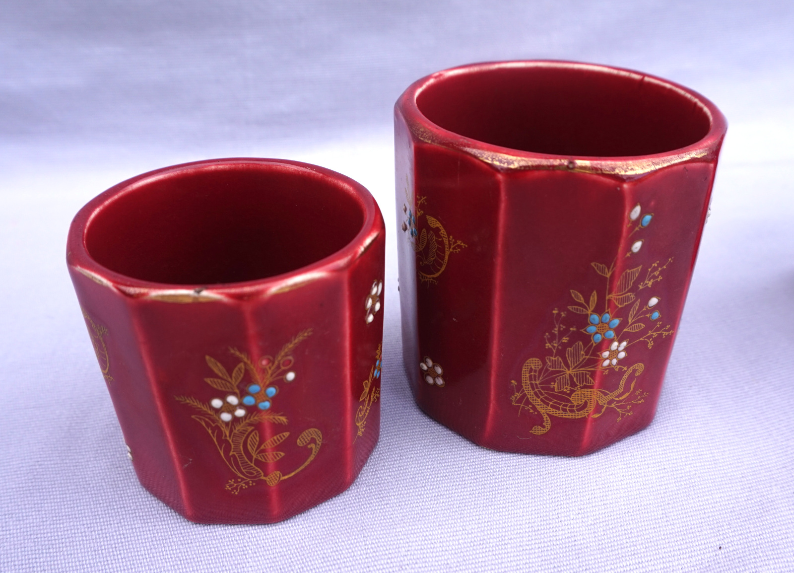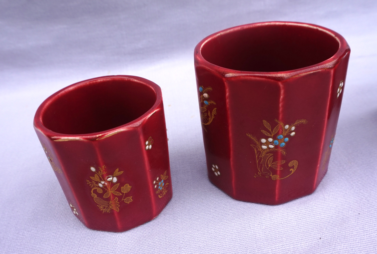 French hand enameled faience tobacco set including lidded jar, 2 pots and shose made by De Bruyn in Fives Lille during the 1900's. Signed on the back. They measures: for the lidded jar 4 1/4" (10.8cm) height diameter 3 3/4" (9.5cm) diameter, for the 2 pot 2 1/2" (6.3cm) and 3" (7.7cm) height, 2 1/2" (6.3cm) and 3" (7.7cm) diameter, for the shoe 5 1/8" (13cm) length. Good condition one repair on the back of the lid and on the end of the shose.