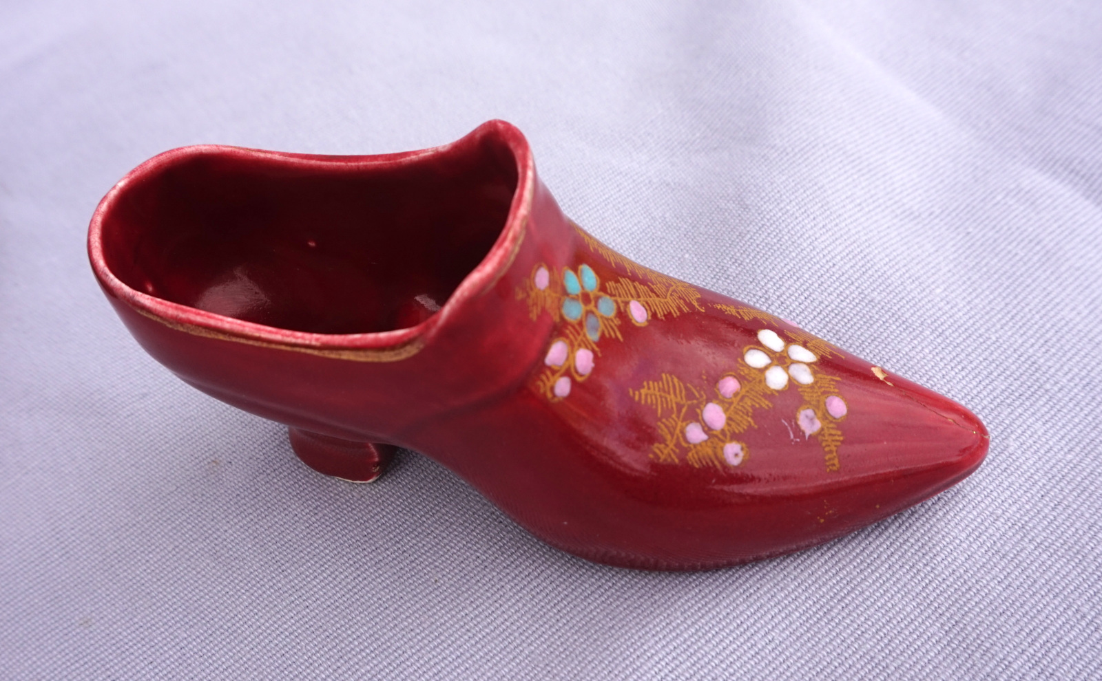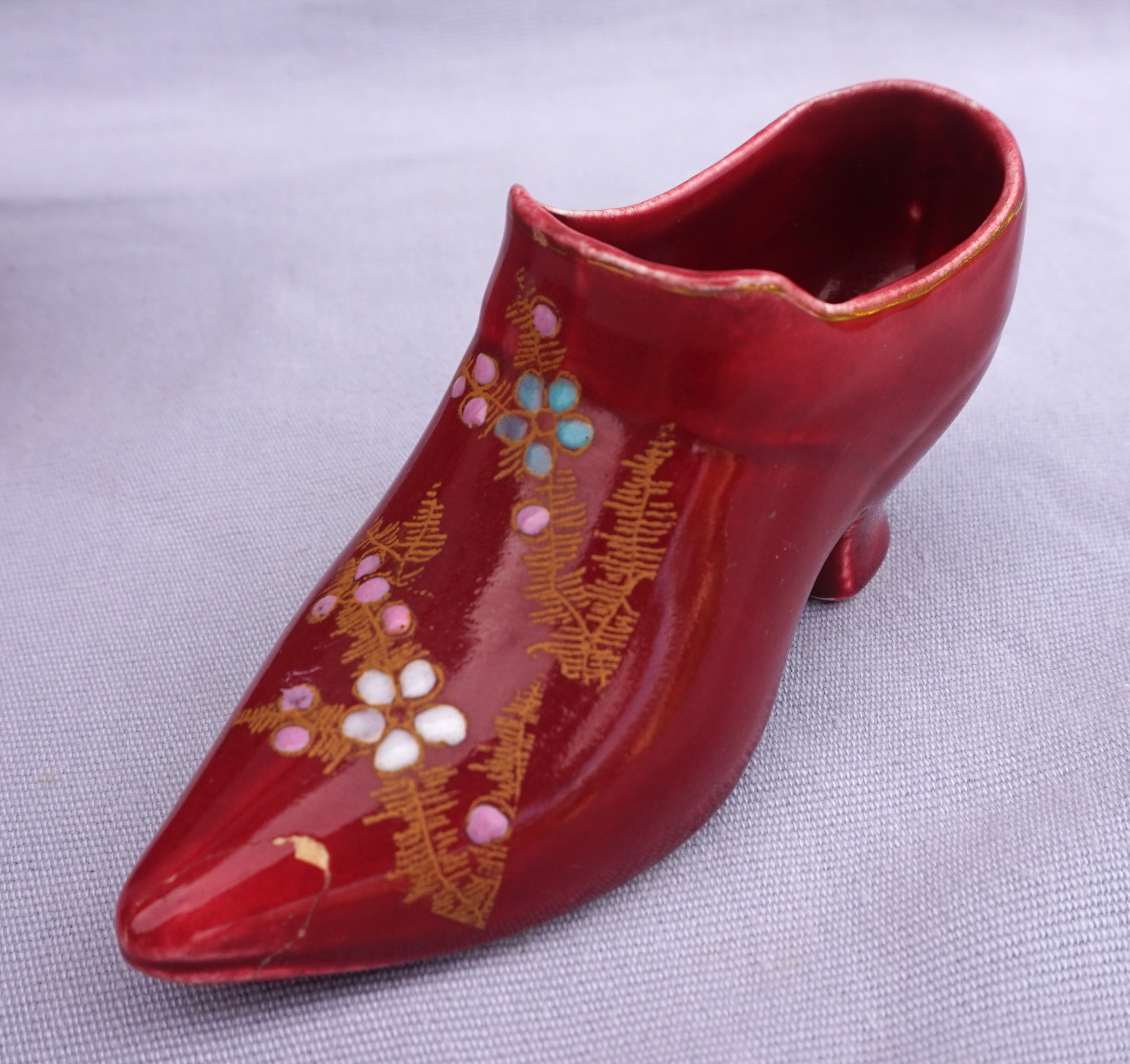 Ensemble pour le tabac en faience émaillée comprenant, 3 pots dont 1 à couvercle et une chaussure , De Bruyn Fives Lille vers 1900. Signature au dos. Dimensions: grand pot à couvercle hauteur 10.8 cm, diamètre 9.5 cm, pour les deux autres diamètre 6.3 cm et 7.7 cm, hauteur 6.3 cm et 7.7 cm, longueur de la chaussure 13 cm. Deux réparations au dos du couvercle et au bout de la chaussure.