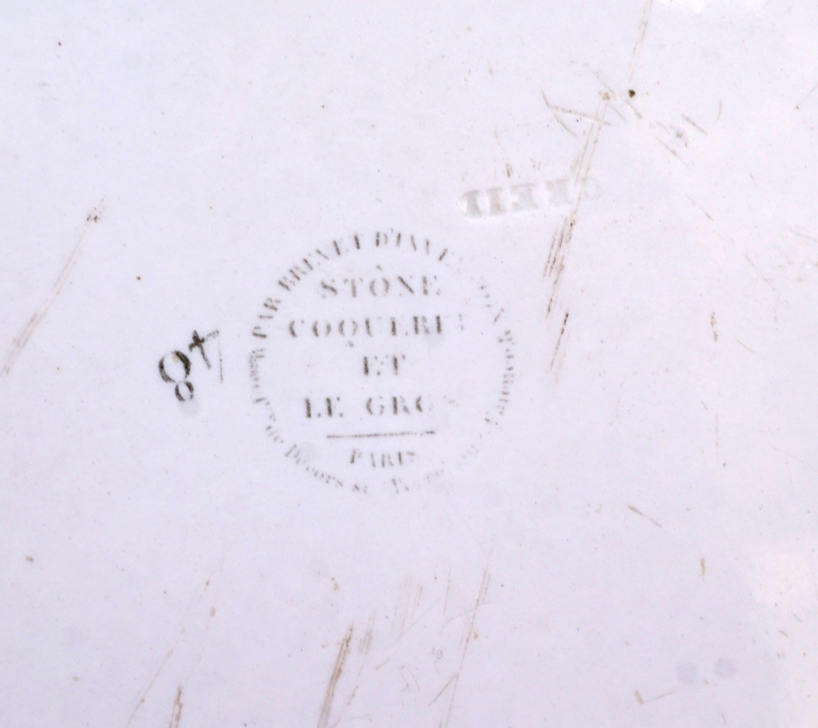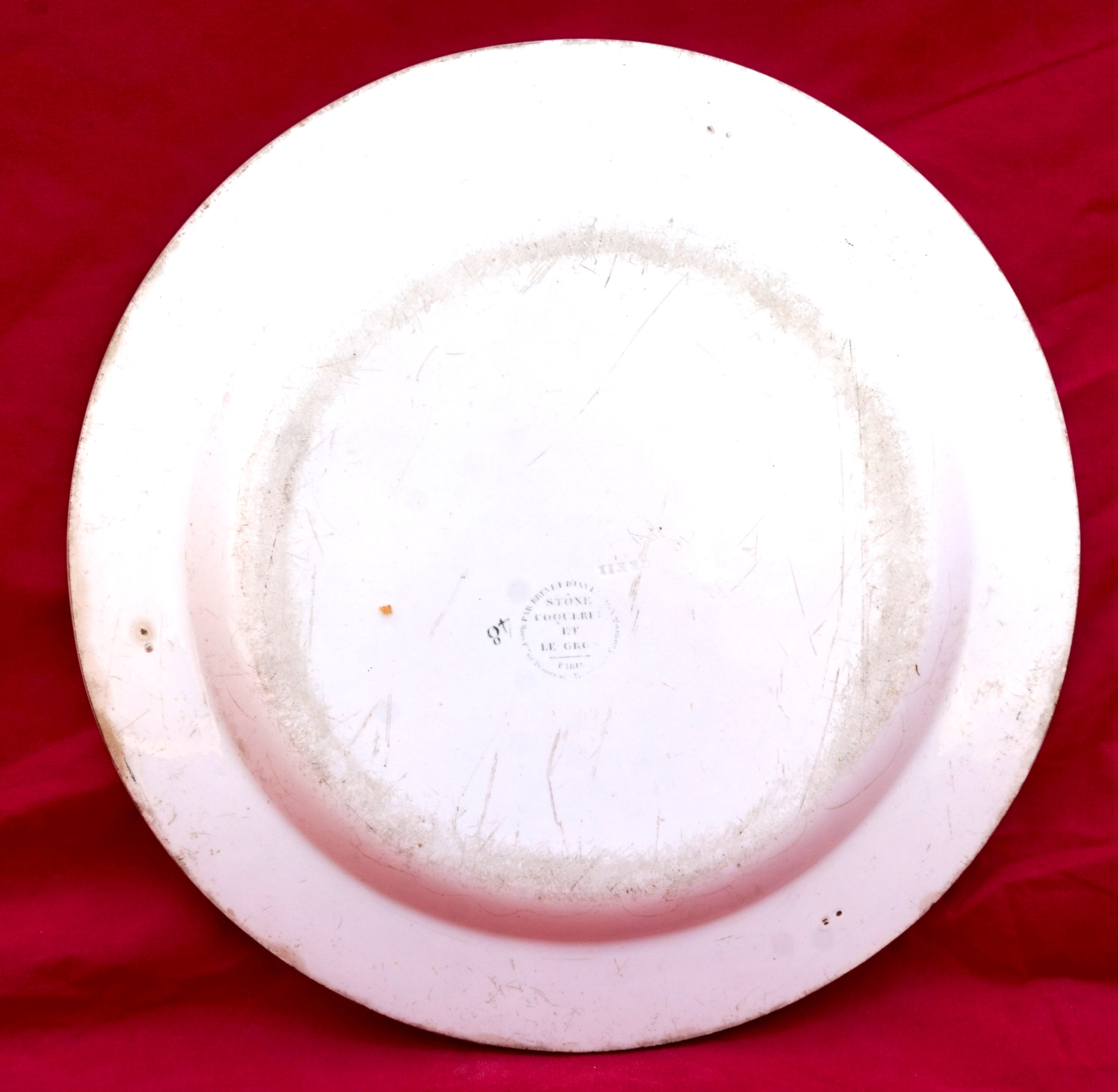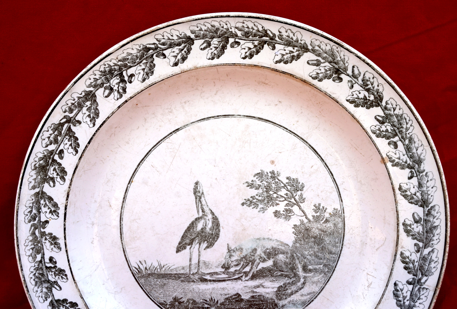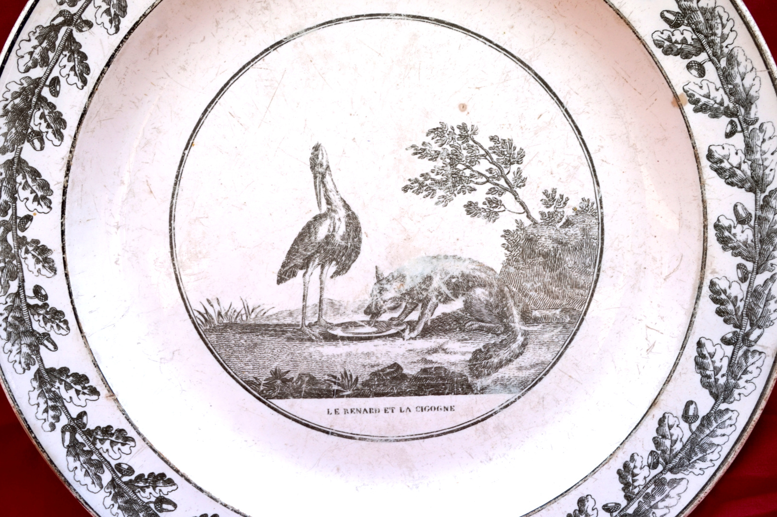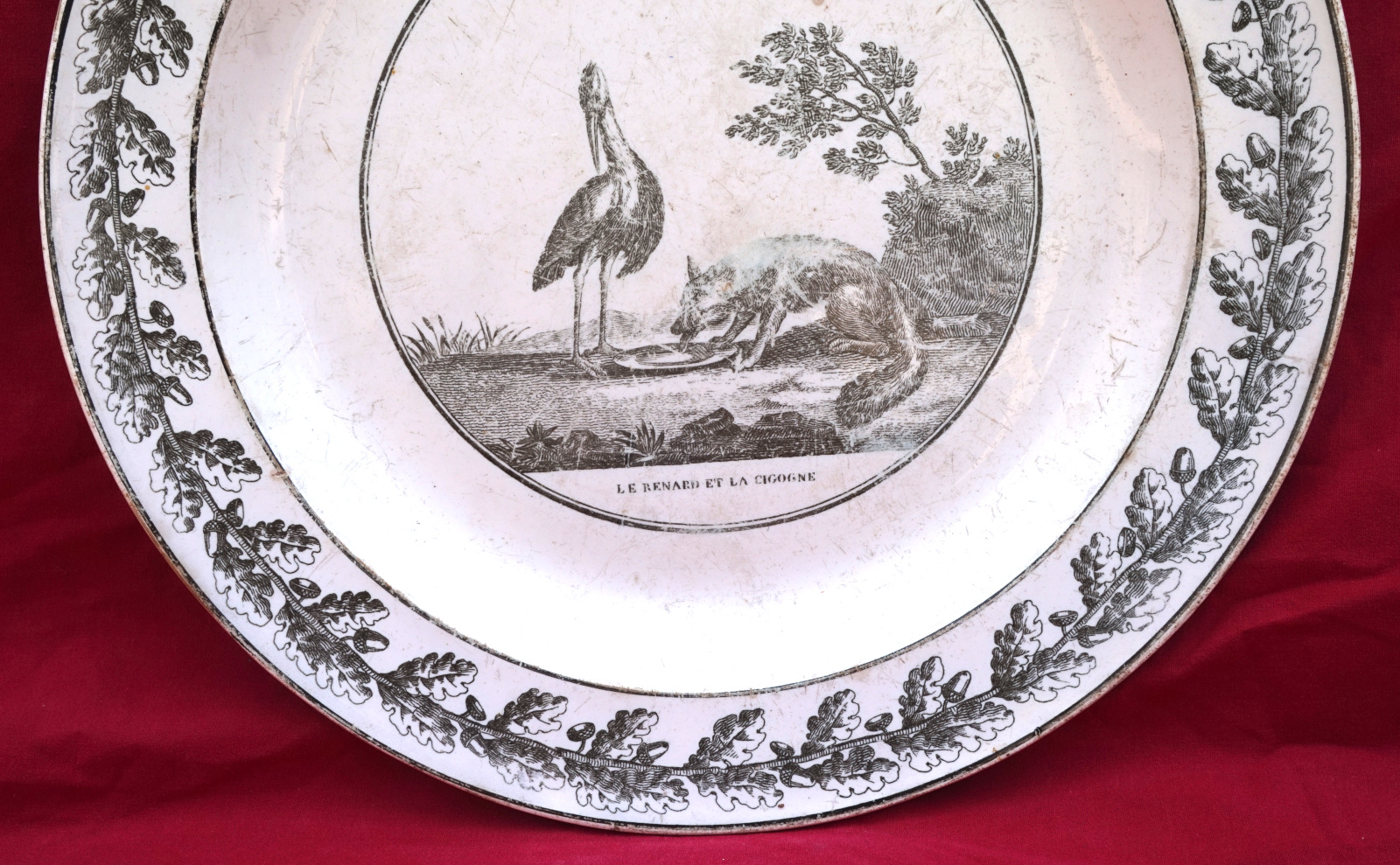 French grisaille faience plate showing the Fox and the Stork , La Fontaine's fable, made by Creil for Coquerel and Le Gros Paris early 19th century. 9 5/8" (24.5cm) diameter. Good condition lightly used.