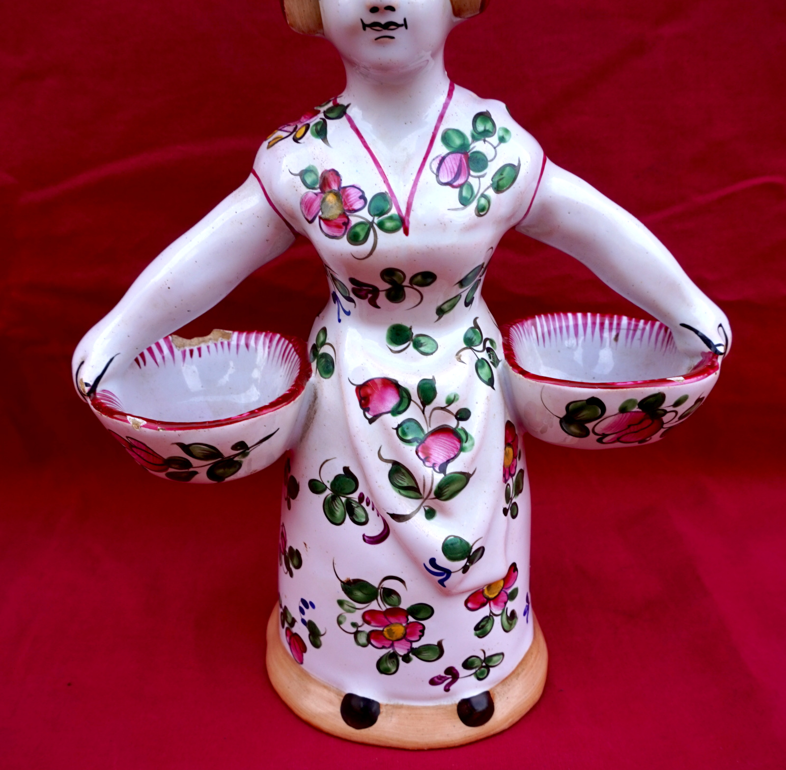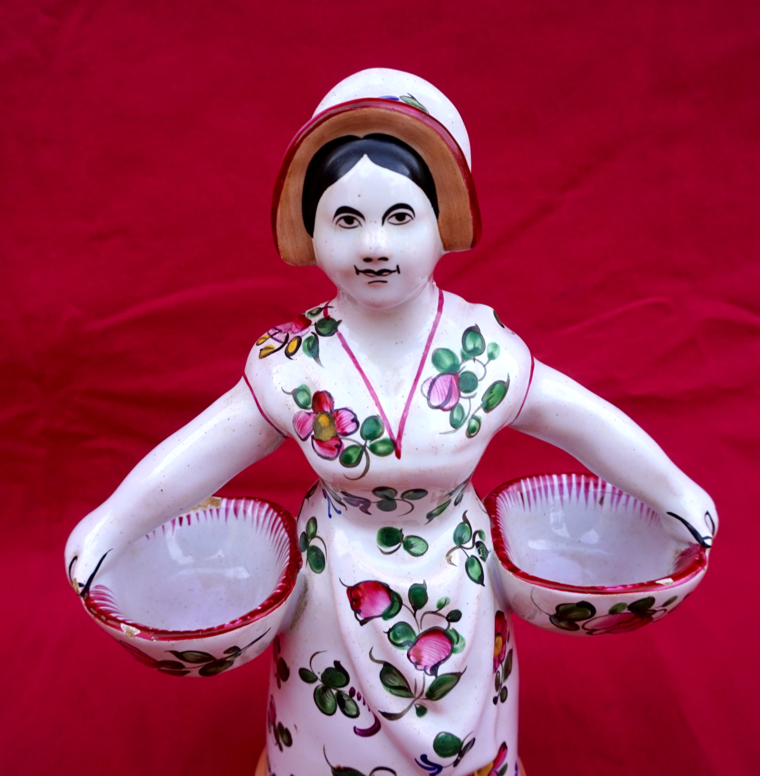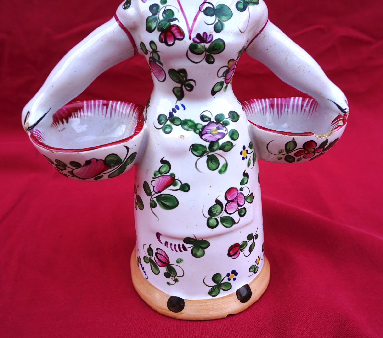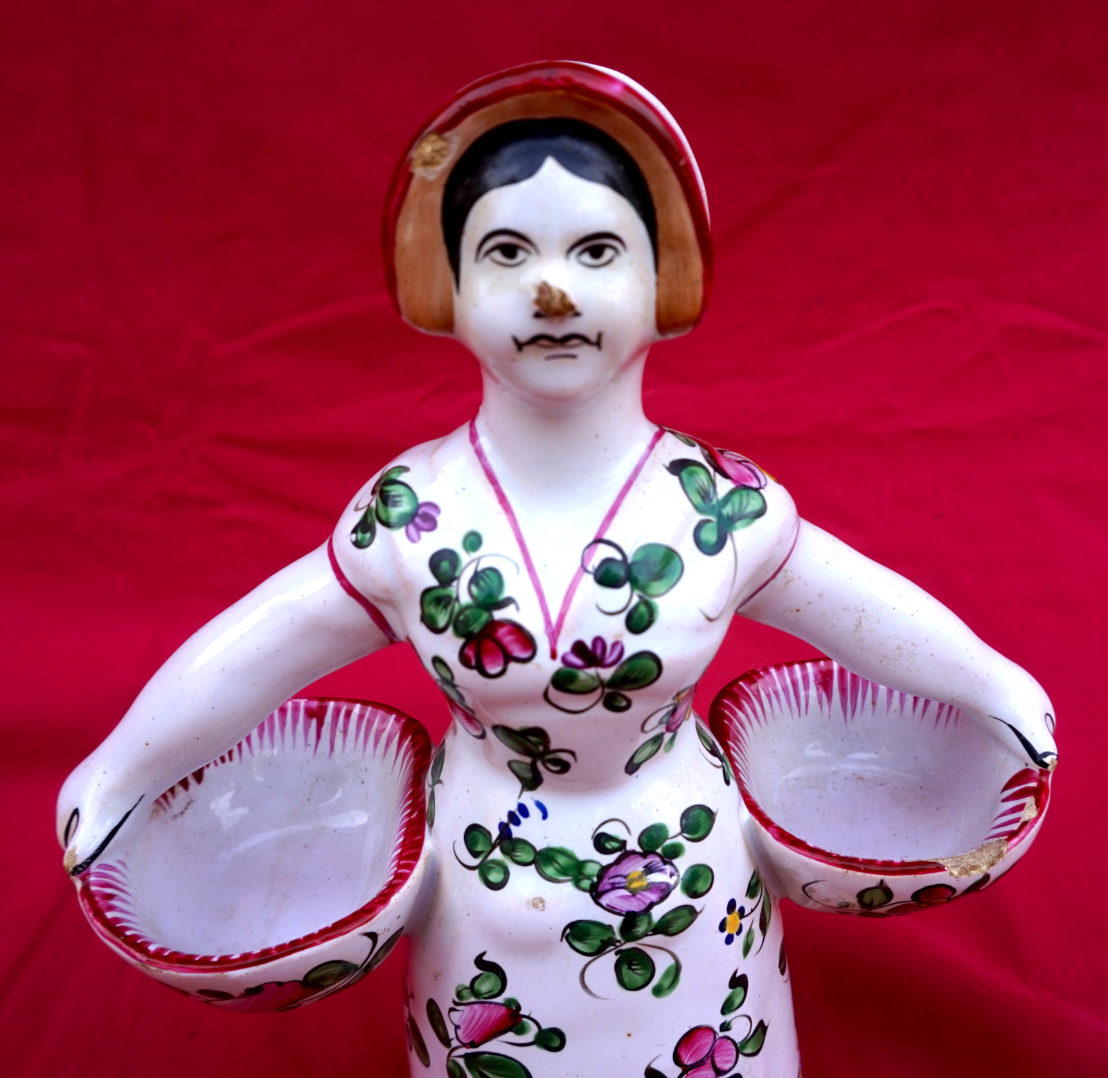 French hand painted faience open salt cellars young farmer woman figure made by Saint Clement France early 20th century. 71/2" (19cm) height, 6" (15.2cm) width. A few small chips and glaze shortages.