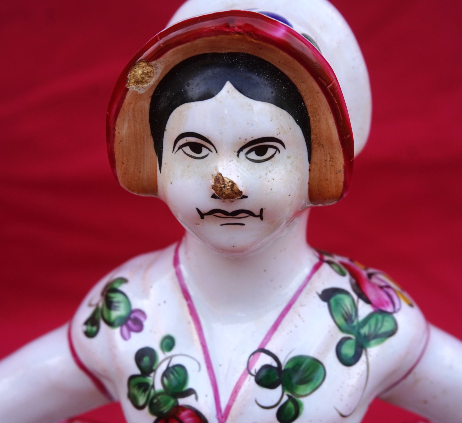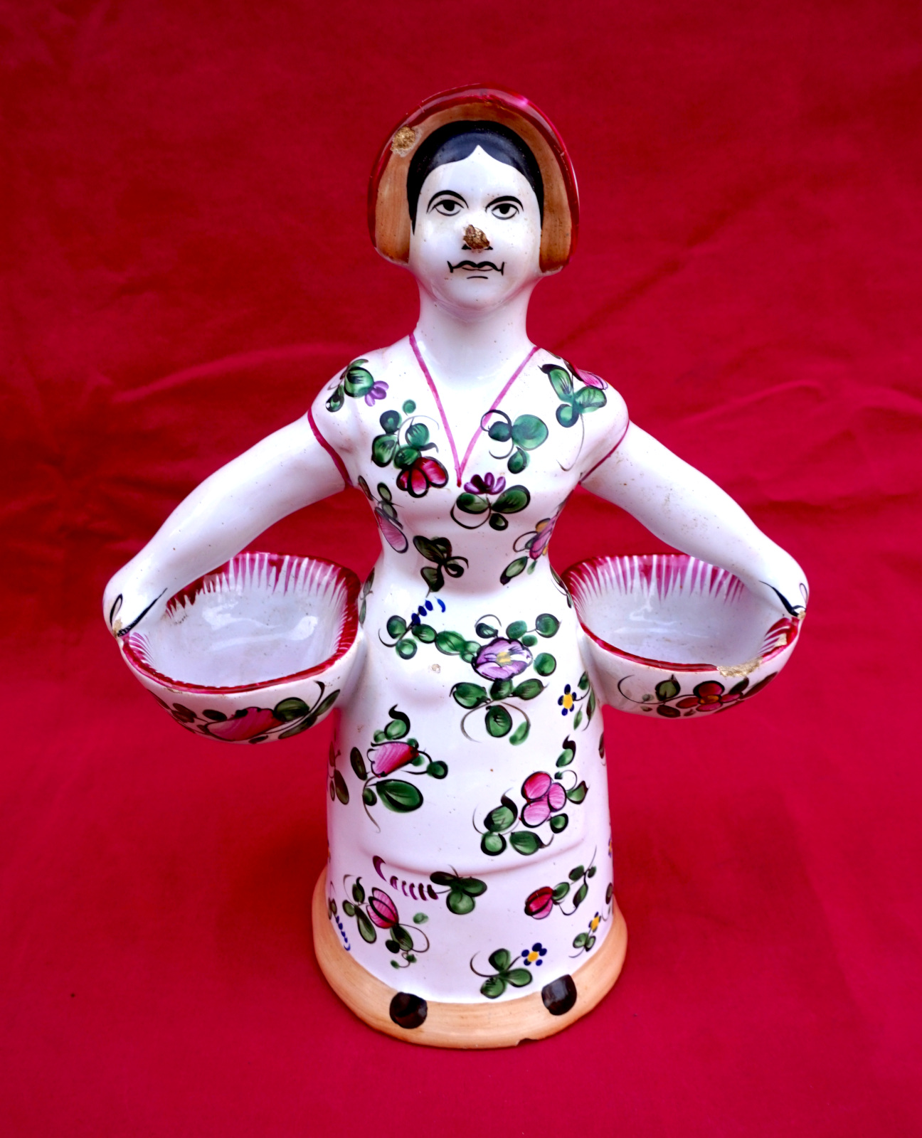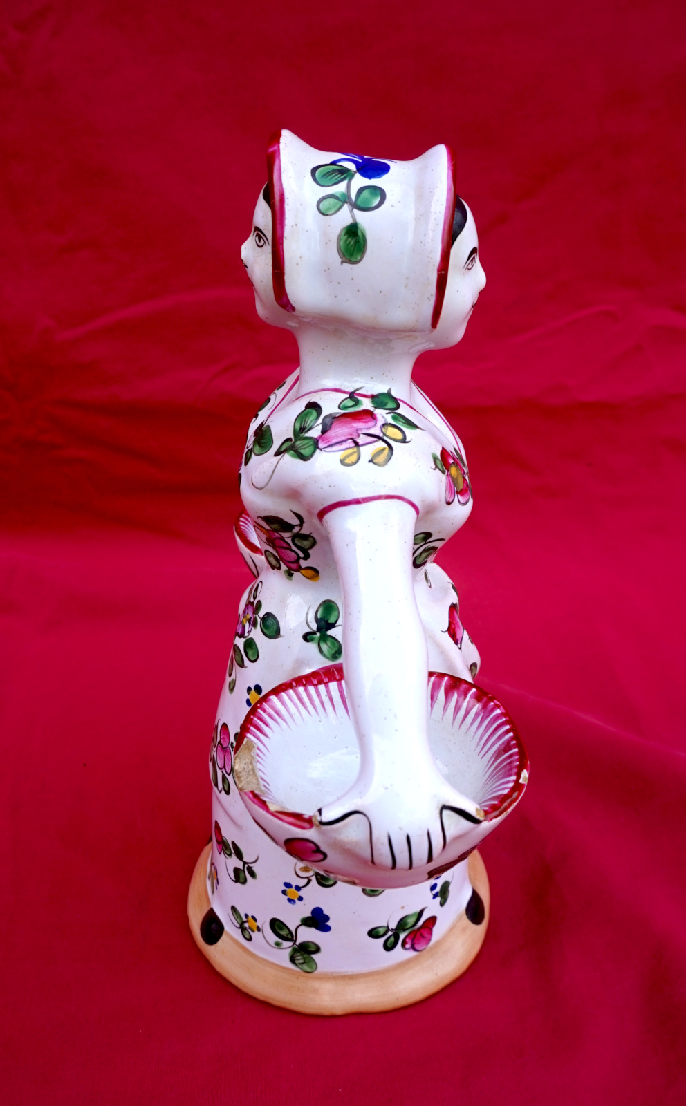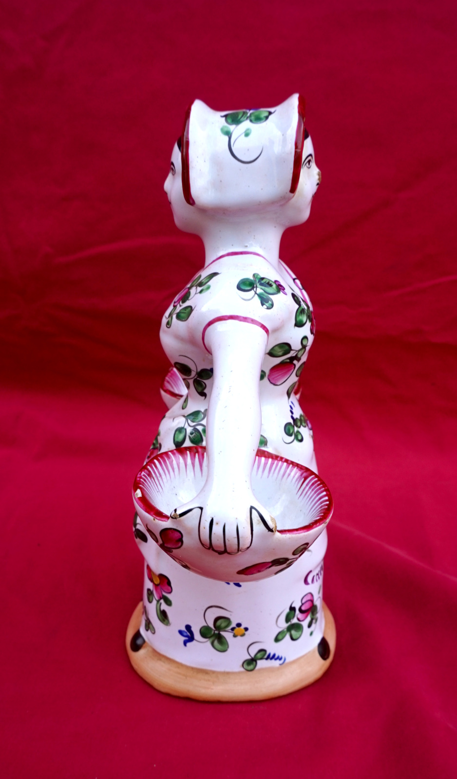 French hand painted faience open salt cellars young farmer woman figure made by Saint Clement France early 20th century. 71/2" (19cm) height, 6" (15.2cm) width. A few small chips and glaze shortages.