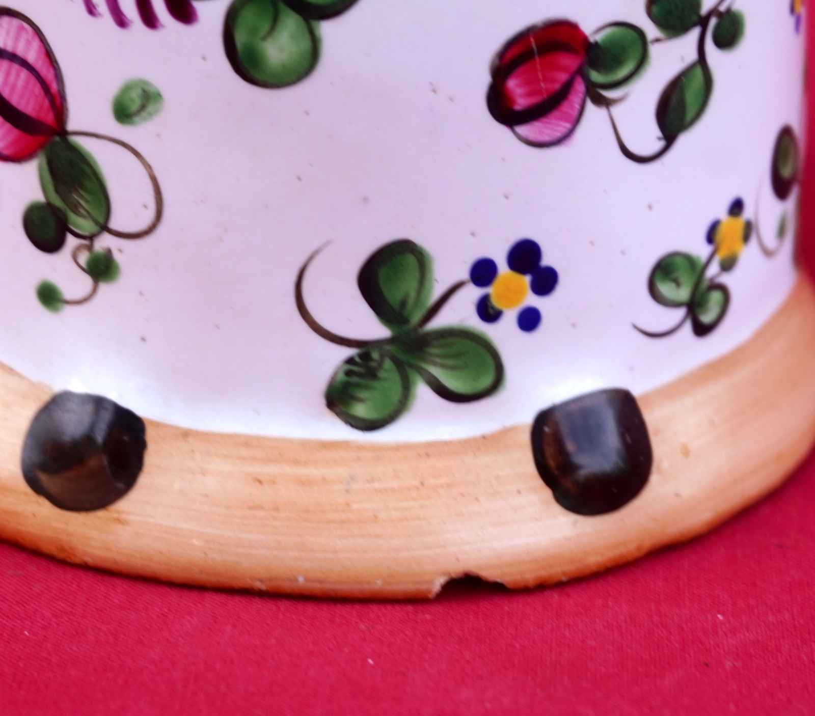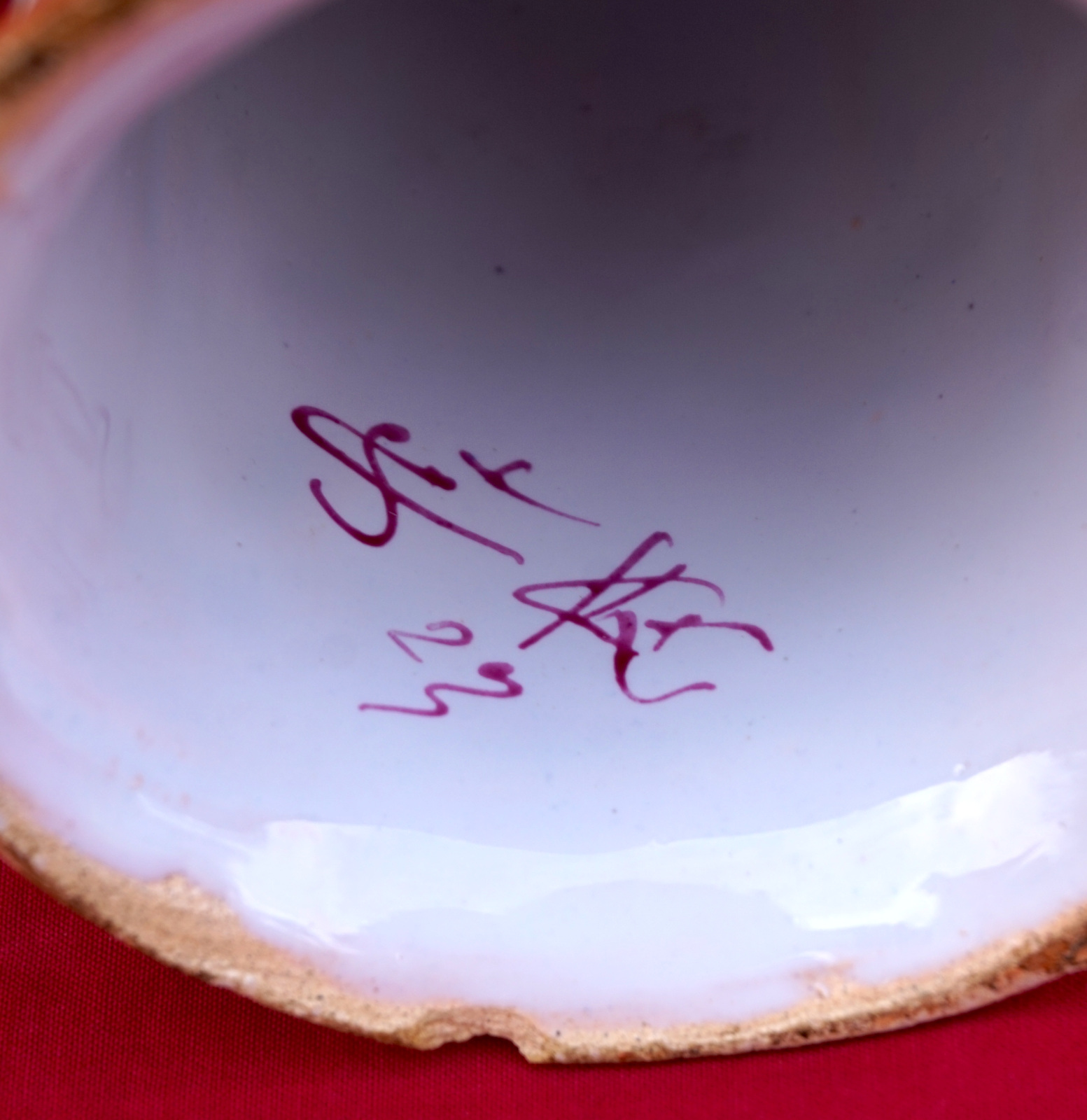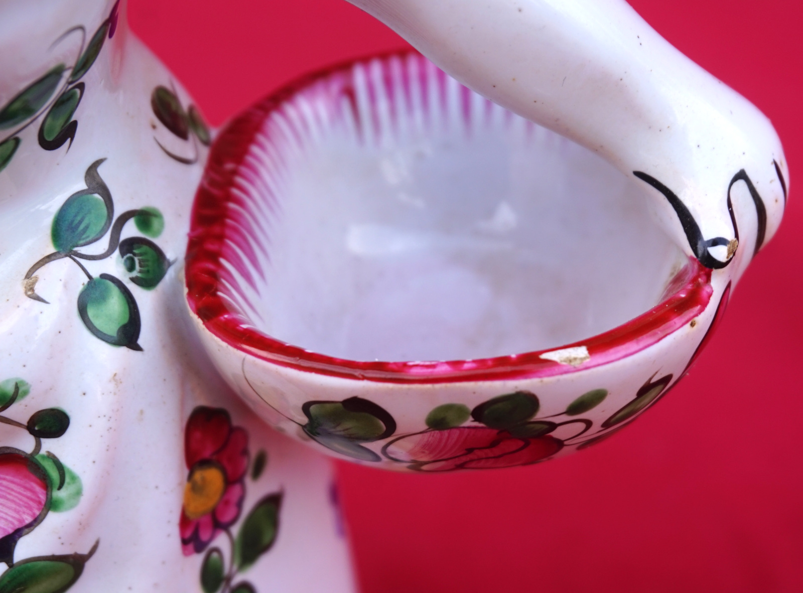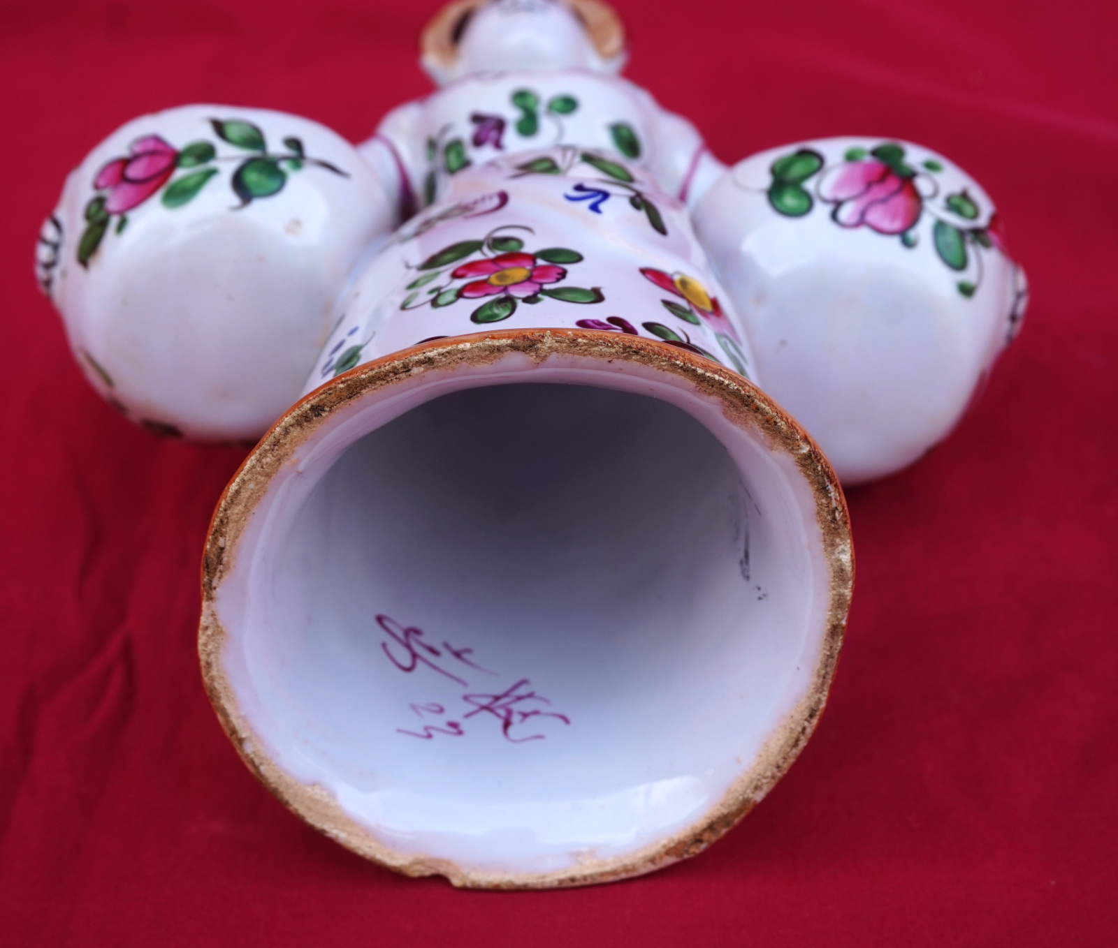 French hand painted faience open salt cellars young farmer woman figure made by Saint Clement France early 20th century. 71/2" (19cm) height, 6" (15.2cm) width. A few small chips and glaze shortages.