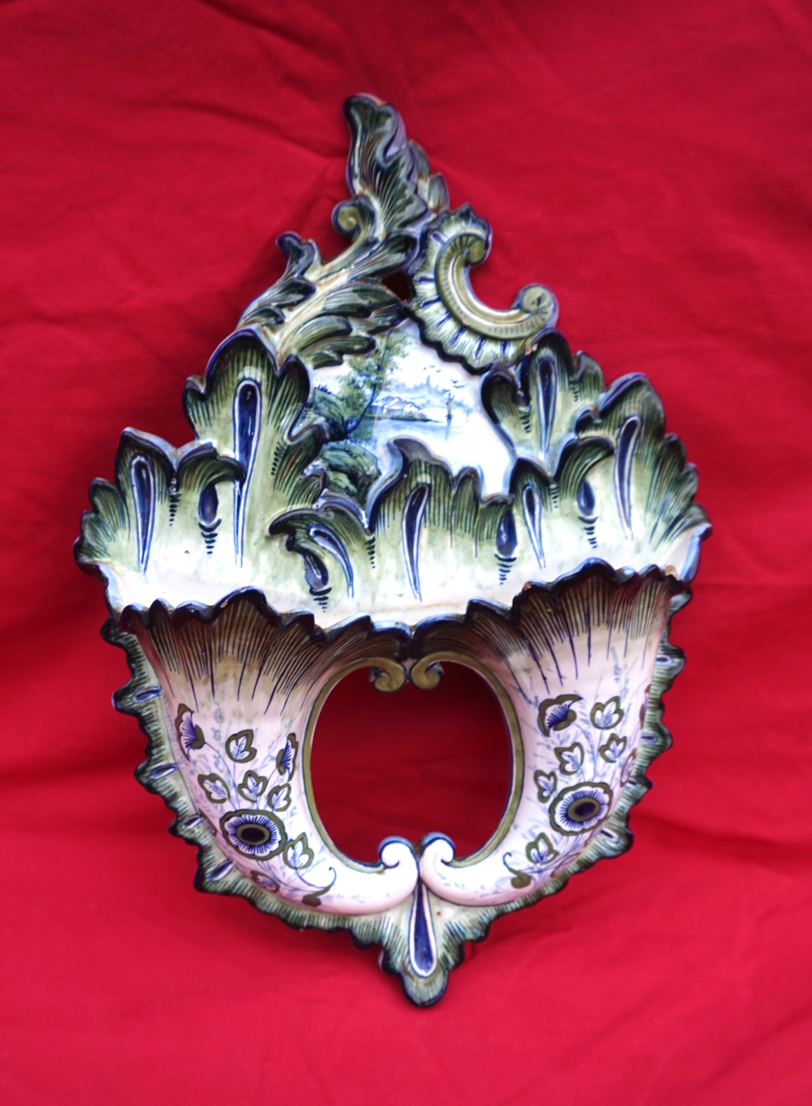 French hand painted faience double wall pocket made by Keller and Guerin in Saint Clement late 19th century. 15" (38.2cm) height, 10 7/8" (27.5cm) width, 3" (7.5cm) depth. Good condition a small chip on the enf of one leaf.