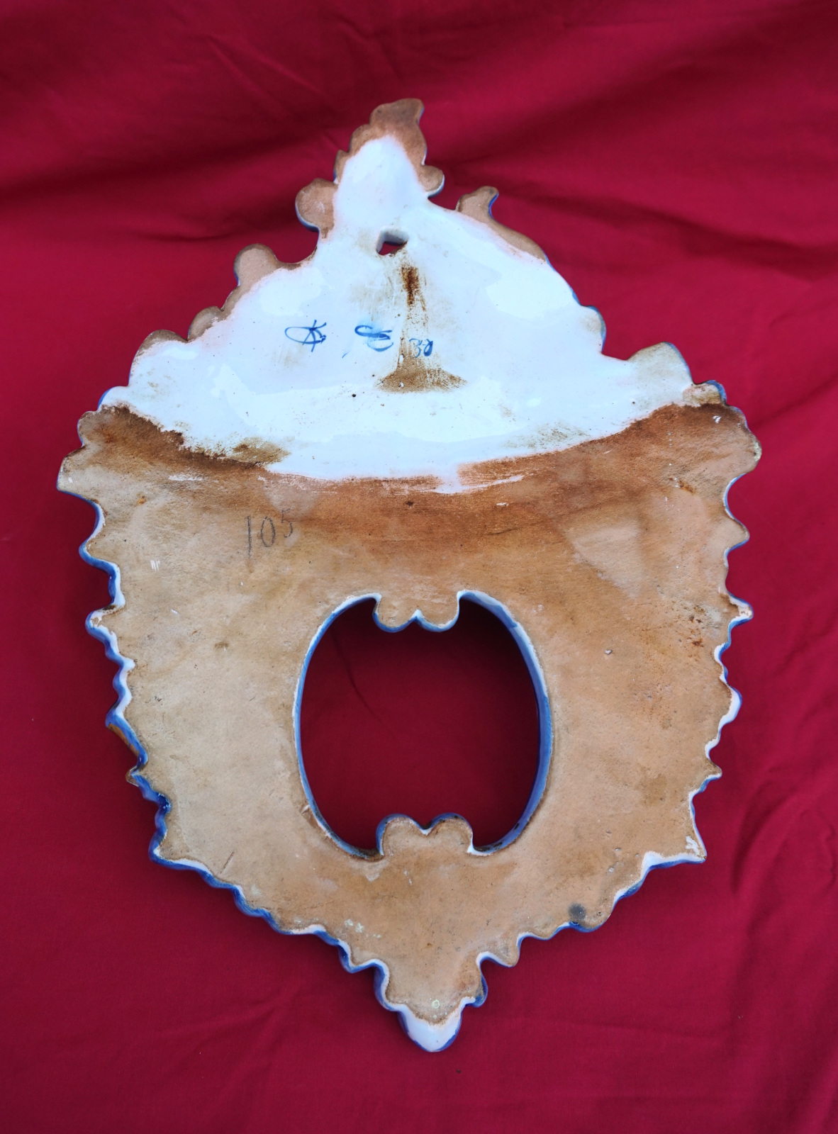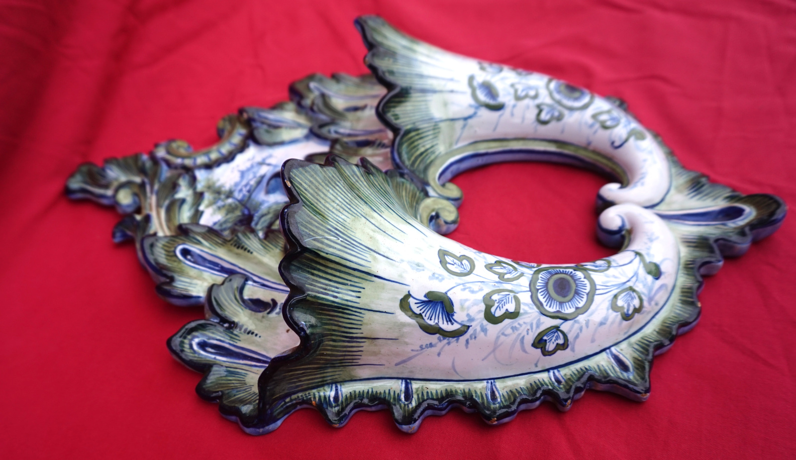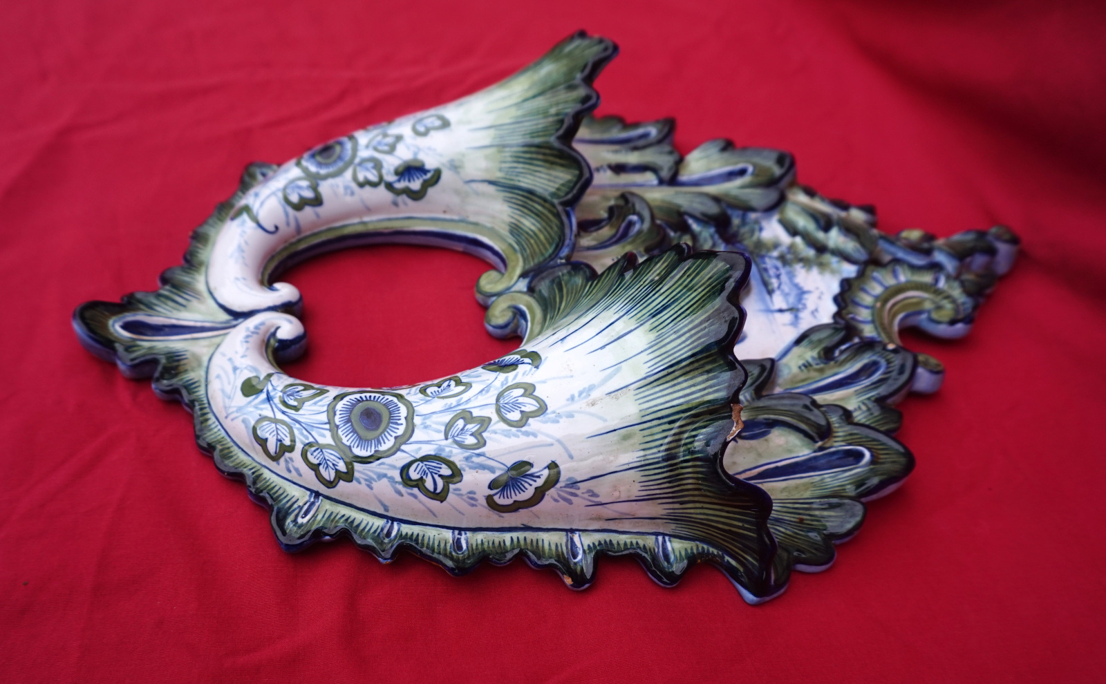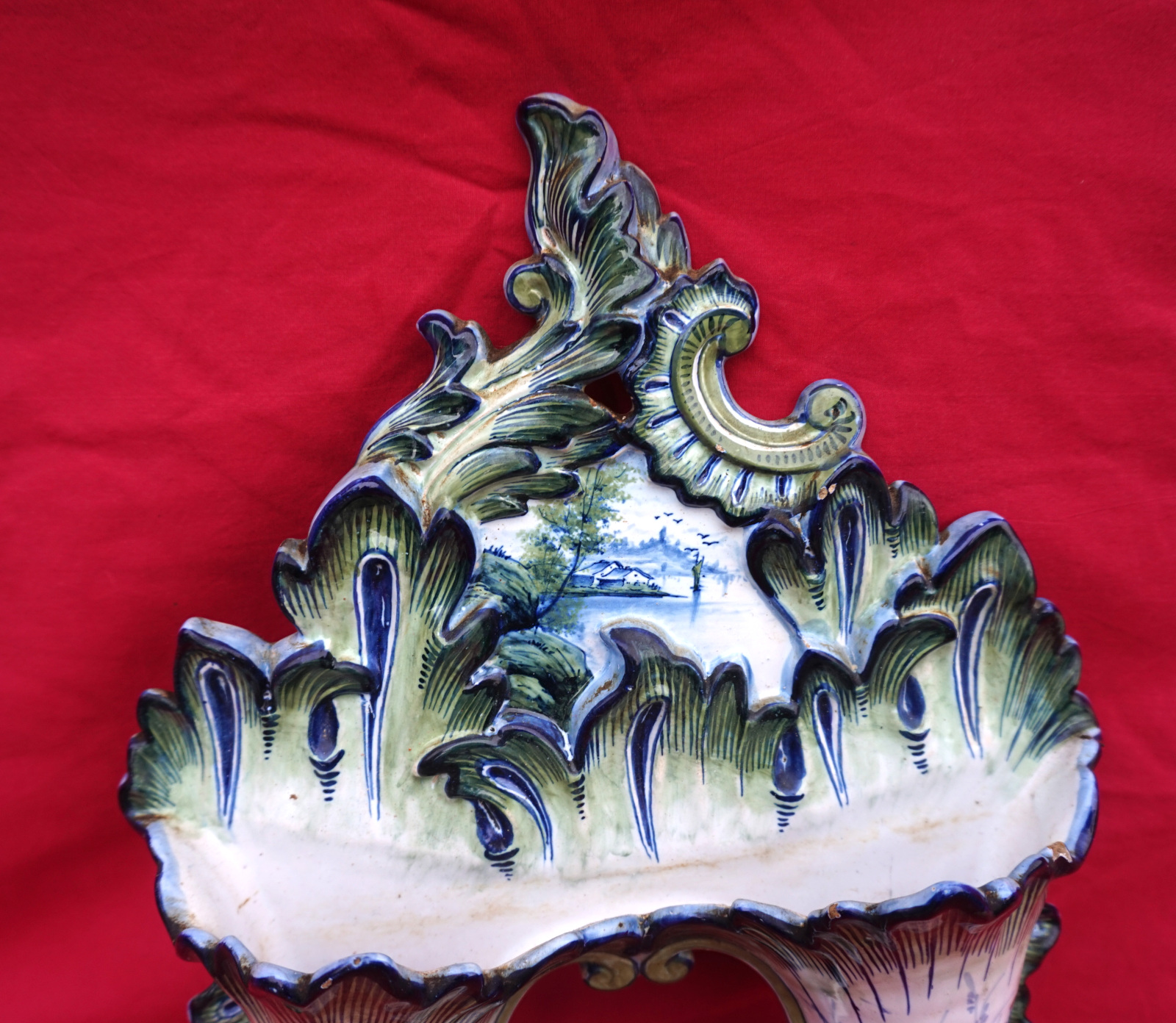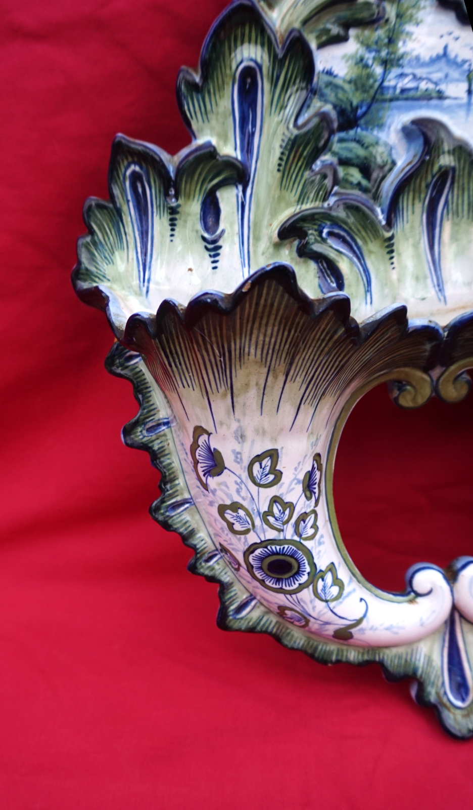 Double cornet mural en faience peinte à la main par Keller et Guérin à St Clément, fin XIX° siècle. Hauteur 38.2 cm, largeur 27.5 cm, profondeur 7.5 cm. Bel état, un éclat sur une feuille voir dernière photo.