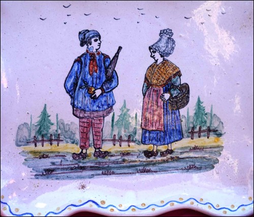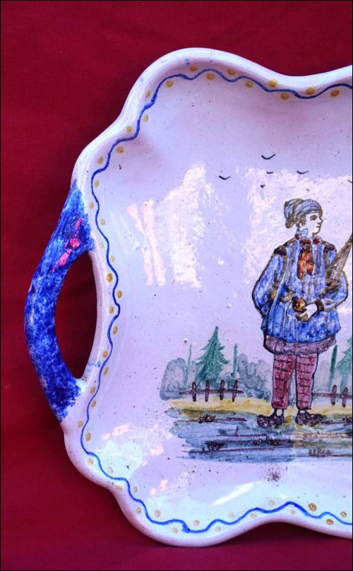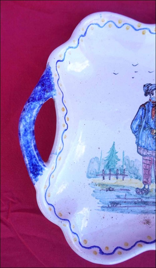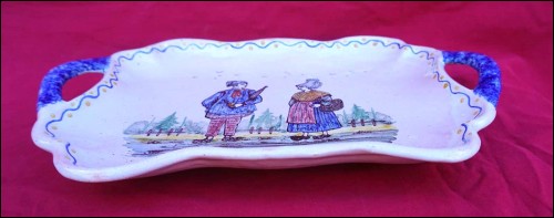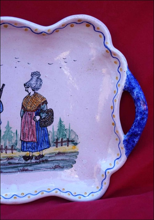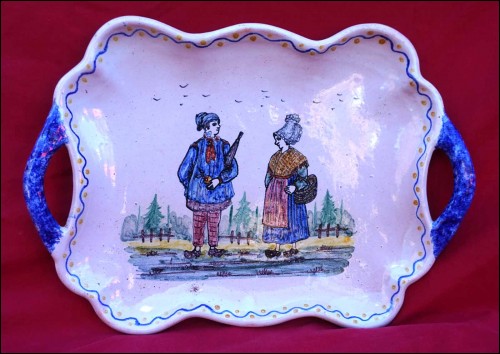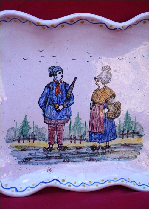 French hand painted faience rectangular dish tray showing a couple of Normands made by Pouplard and Beatrix during the 1900's. It's signed on the back. 11" (28cm) length, 7 3/4" (19.7cm) width, 1" (2.5cm) depth. Perfect condition as shown by the following pictures.
