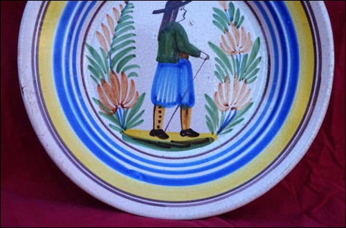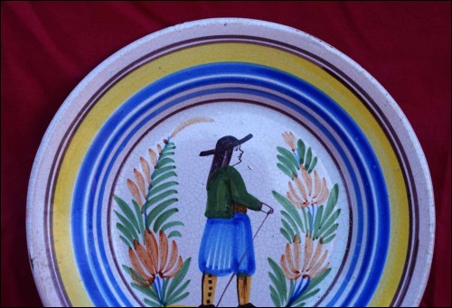 Assiette en faïence peinte à la main au décor du petit breton, Malicorne vers 1910. Diamètre 21.5 cm. Parfait état.