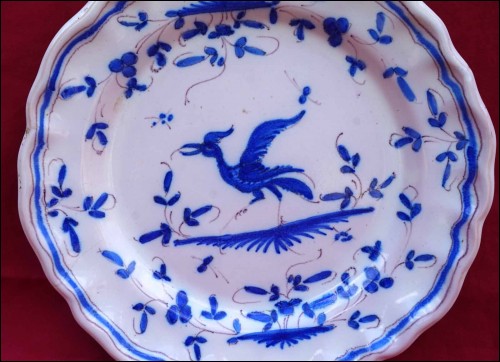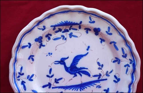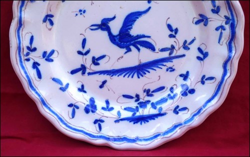 Assiette en faïence bleu de four à décor de héron ou d'ibis, atelier du Matet, Martres Tolosane début XXe siècle. Elle est signée sur son fond. Diamètre 26.2cm. Parfait état.