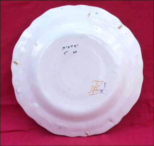 French cobalt blue hand painted scalloped plate showing heron or ibis made by Matet studio in Martres tolosane early 20th century. It's signed on the bottom. 10 3/8" (26.2cm) diameter. Perfect condition as shown by the following pictures.