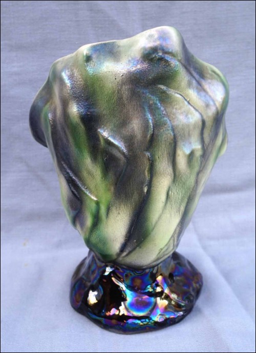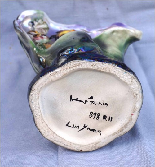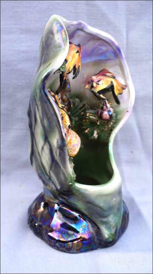 Vintage hand painted faience shell shaped vase or lamp base with fishes in relief and sea life made by Kérina Monaco for Luc sur Mer town. It's signed on the bottom. 8 1/8" (22cm) height, 5 7/8" (15cm) width, 4 1/8" (10.5cm) depth. Good condition 2 tiny chips on the leavesinside the shell as shown by the following pictures.