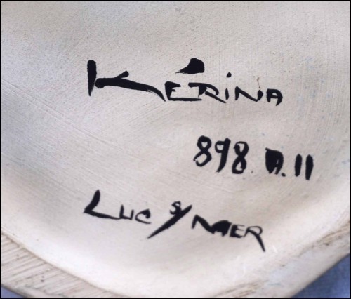 Vase en faïence décoré main par Kérina Monaco pour la ville de Luc sur Mer. Hauteur 22 cm, largeur 15 cm, profondeur 10.5 cm. Signé sur son fond. Très bel état, 2 petites grenures sur les feuilles à l'intérieur.