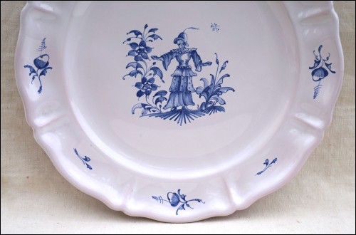 Assiette en faïence de Stefani Jean Louis Le Fayencier de Moustiers fin du XXe siècle. Décor de la dame aux fleurs en camaïeu bleu. Bel état, traces de pernettes, signée sur le fond. Diamètre 25,5 cm.