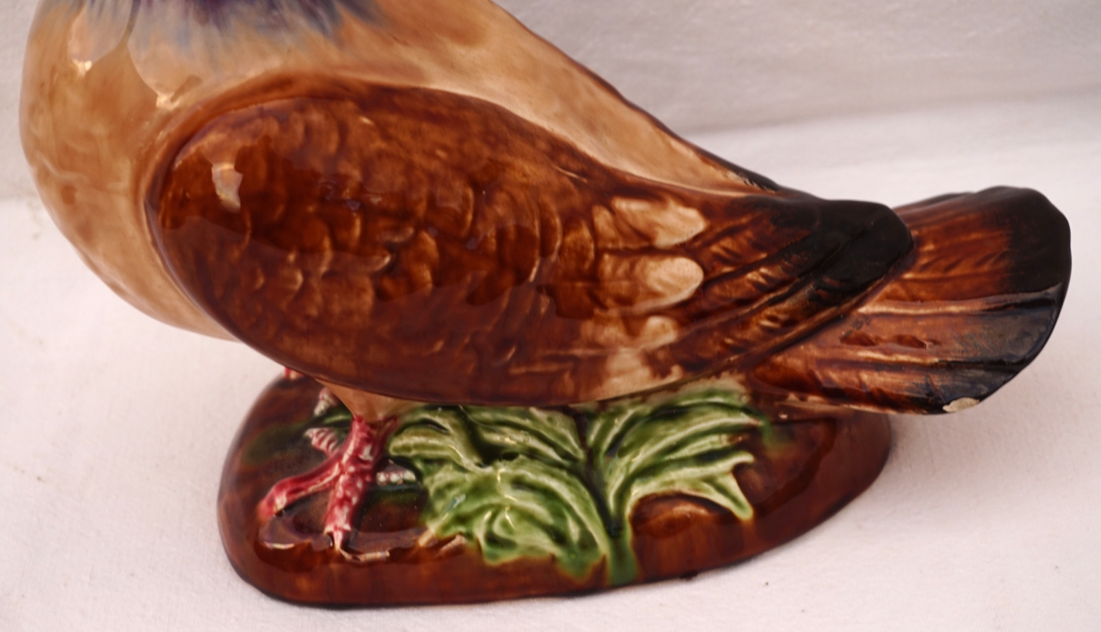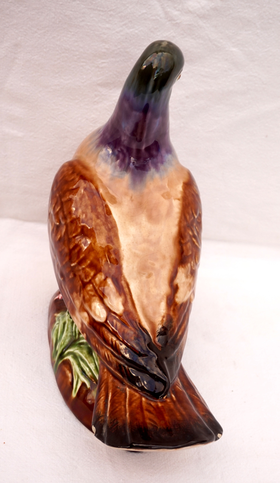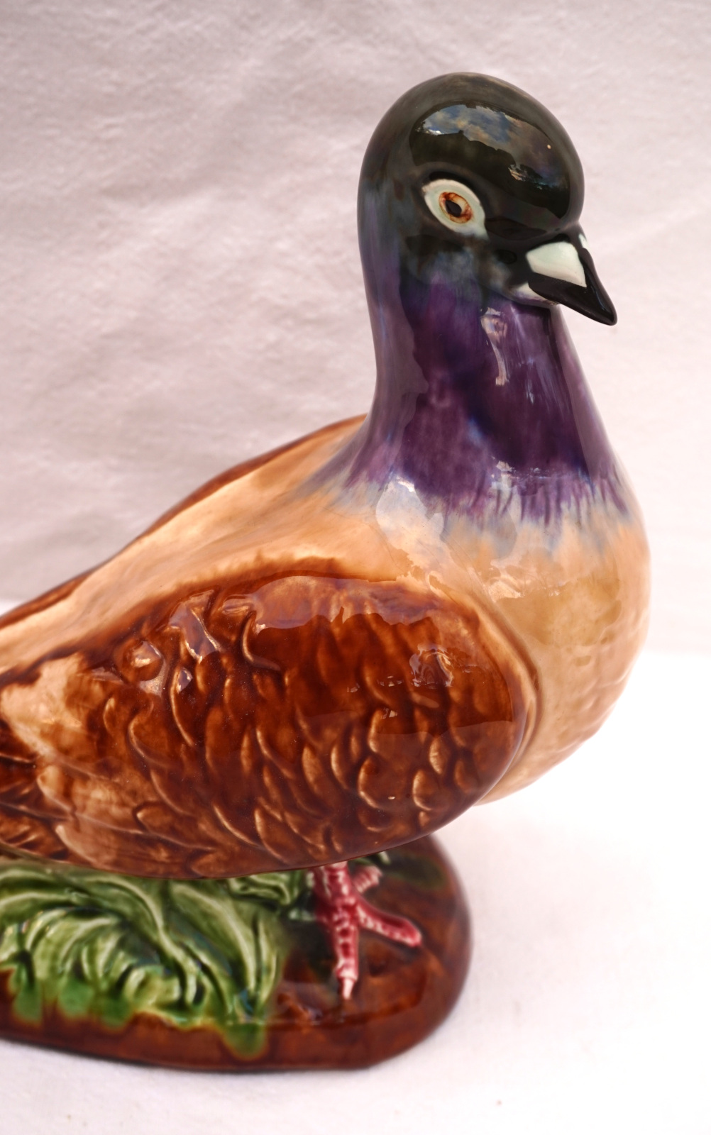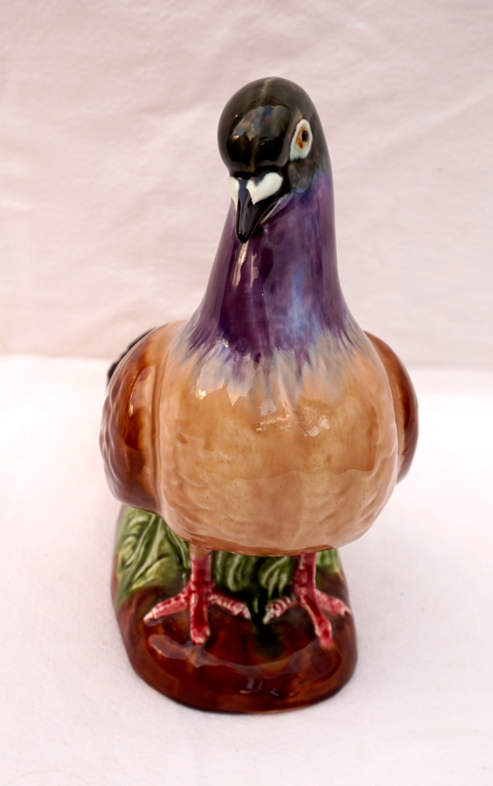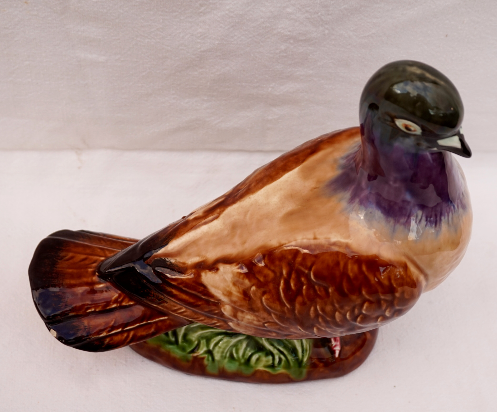 French hand painted majolica pigeon, dove, made by Orchies Moulin des Loups during the 1930's. It's signed on the back. 9 3/4" (25cm) height, 9 1/2" (24cm) length, 5" (12.7cm) width. Beautiful condition two small chips on the tail as shown by the following pictures.