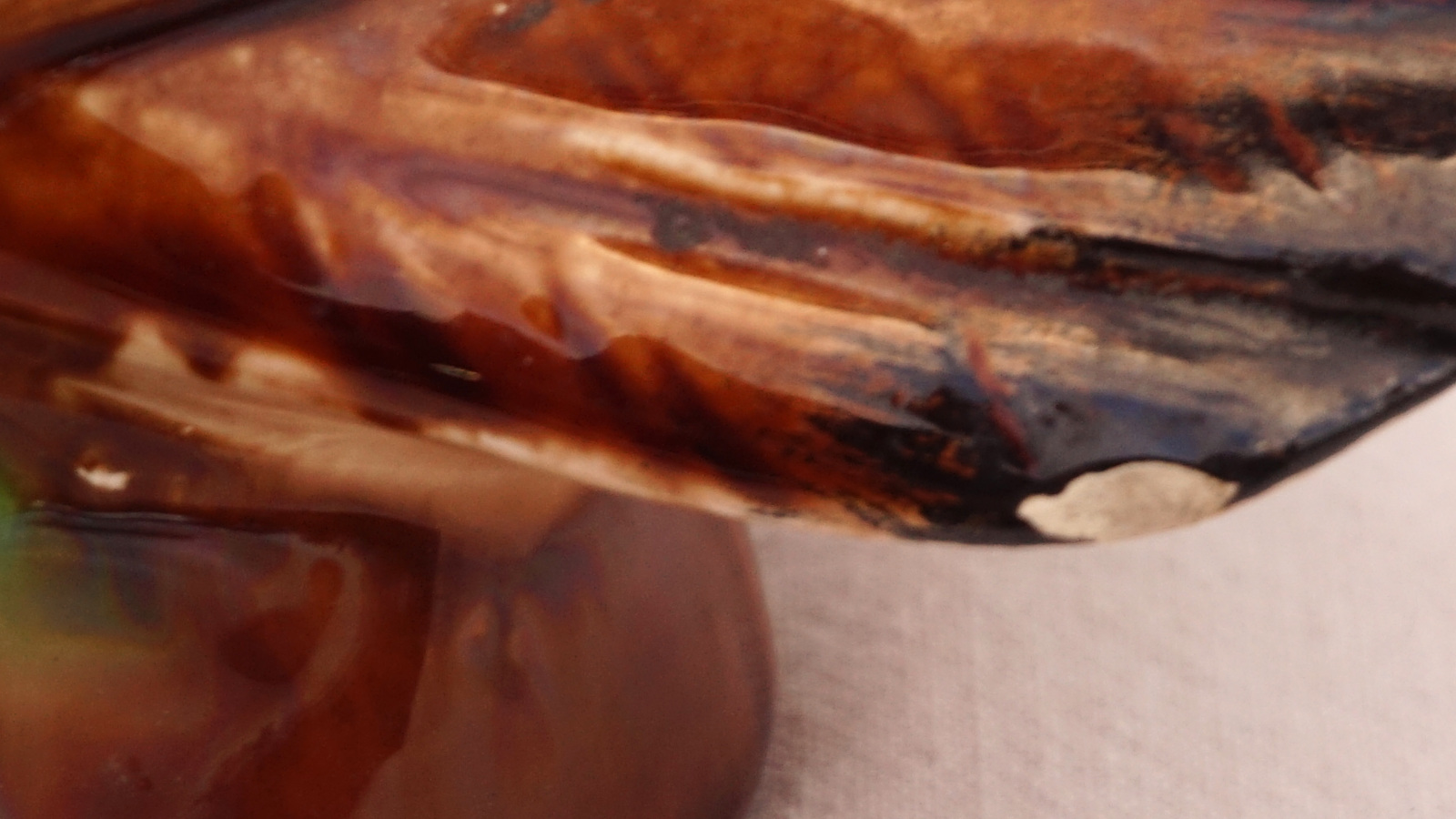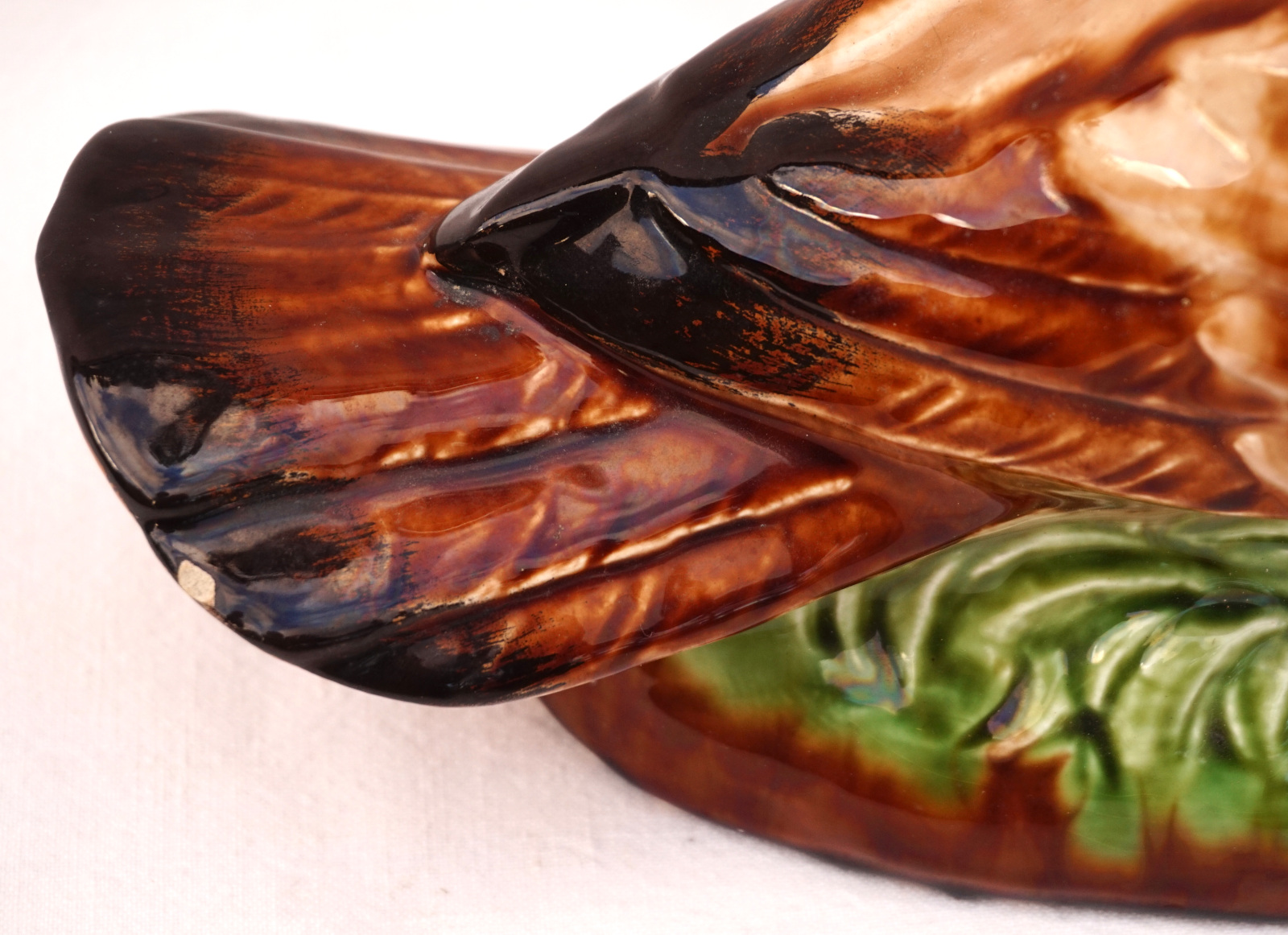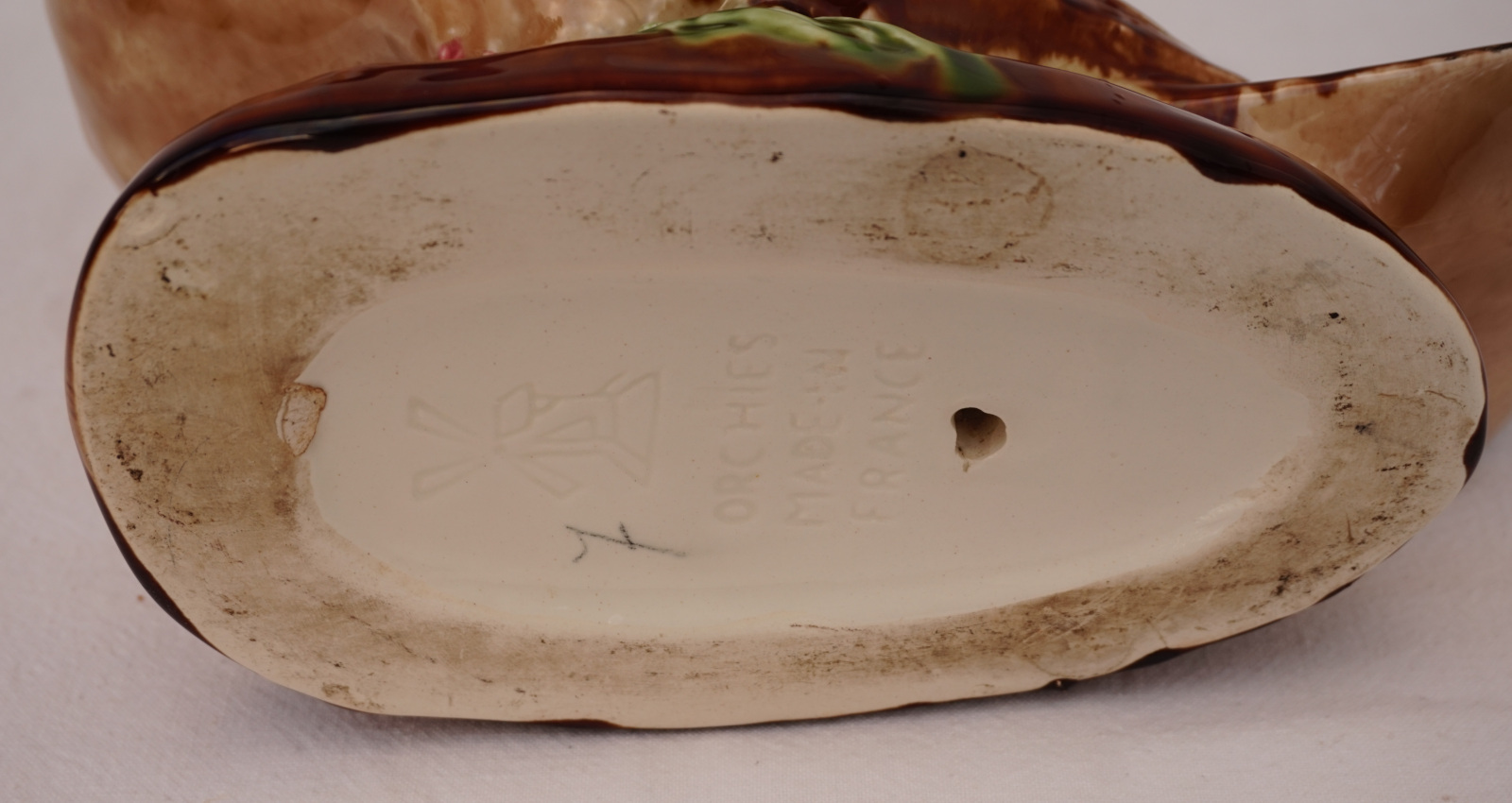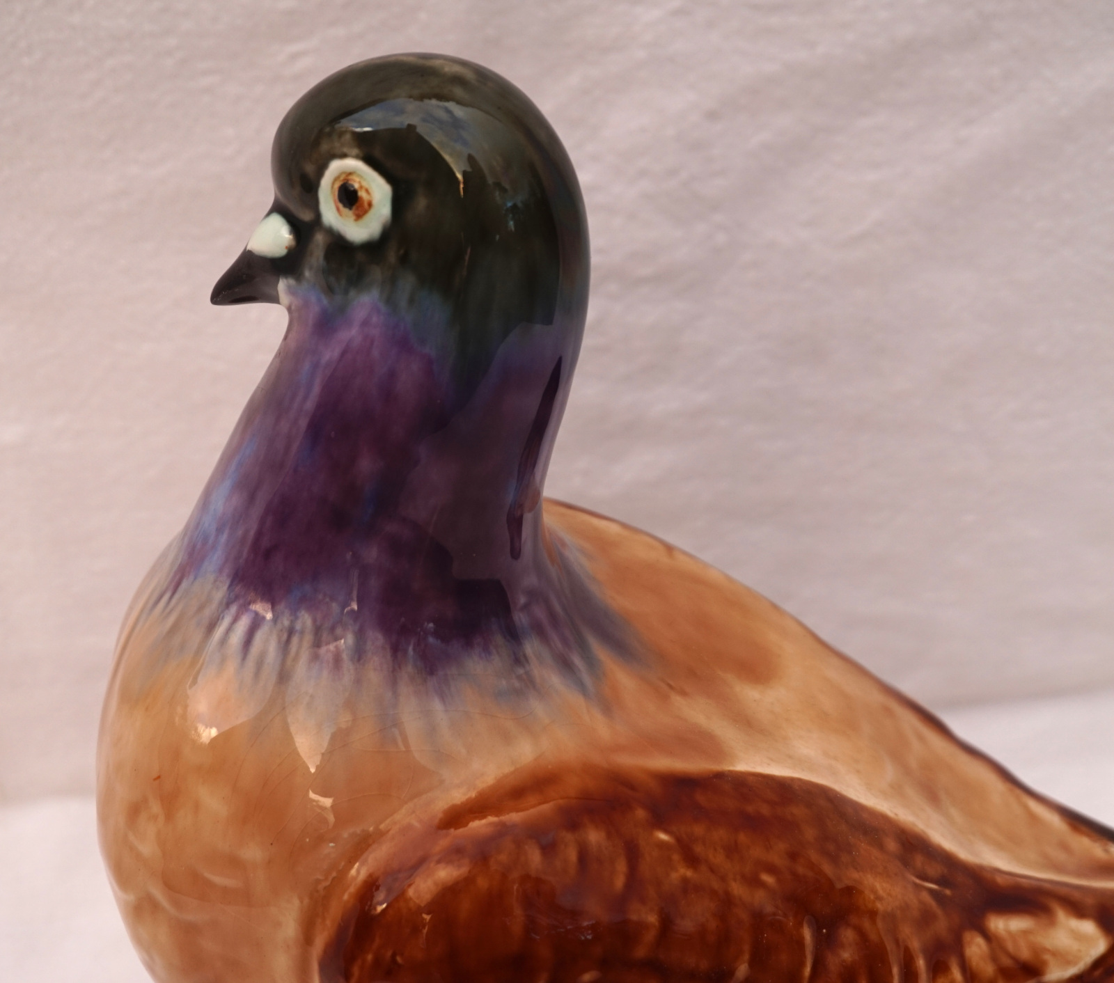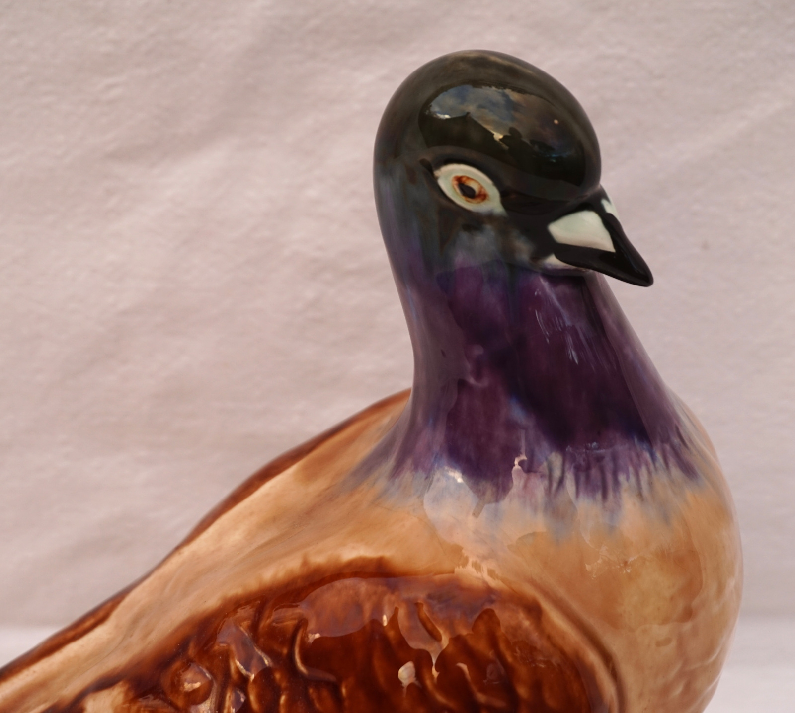 French hand painted majolica pigeon, dove, made by Orchies Moulin des Loups during the 1930's. It's signed on the back. 9 3/4" (25cm) height, 9 1/2" (24cm) length, 5" (12.7cm) width. Beautiful condition two small chips on the tail as shown by the following pictures.