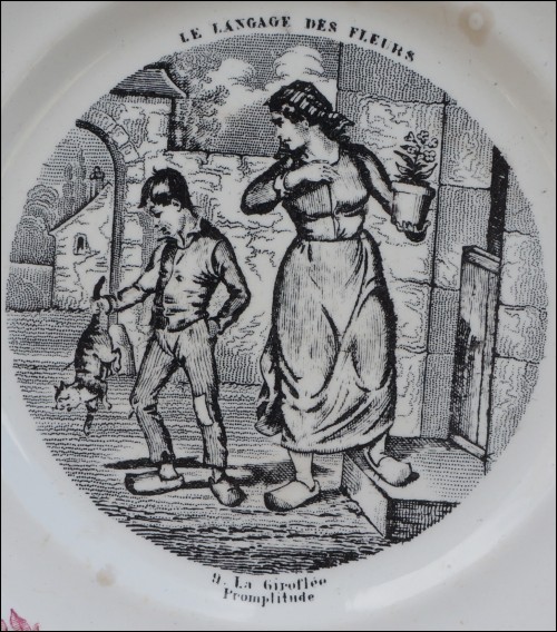 Assiette parlante imprimée d'Hippolyte Boulenger, le langage des fleurs n°9. Les giroflées, Promptitude, fin XIXème siècle. Bel état, petites tâches. Marque tampon imprimé de HB Choisy-le-Roi Médaille d'or et lettres en creux. Diamètre 16,5 cm.