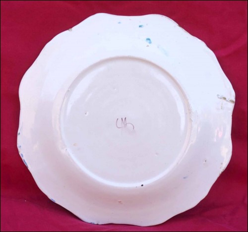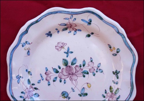 French scalloped plate in hand painted faience showing flowers made in Provence, perhaps Marseille, during the second half of the 19th century. It's signed on the back. 9 1/4" (23.5cm) diameter. Perfect condition as shown by the following pictures.