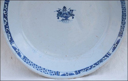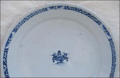 Assiette au panier fleuri en camaïeu de bleus, faïence de Rouen fin du XVIIIe siècle. Bel l'état, les photographies ne cachent rien. Diamètre 23,5 cm épaisseur 3,5 cm.