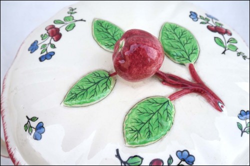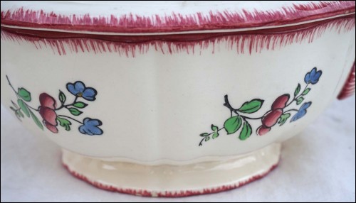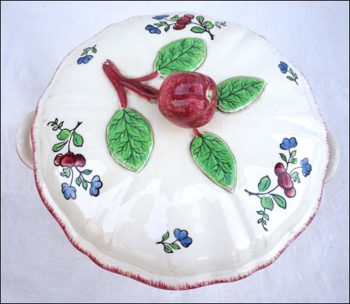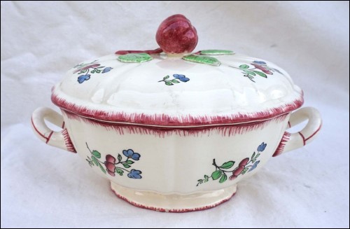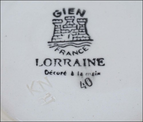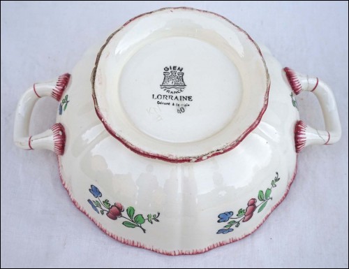 Vintage french hand painted faience small tureen or vegetable dih model Lorraine made by Gien during the 1950's. It's stamped on the back. 9 7/8" (25cm) width 5 1/8" (13cm) height. Good condition a little chips at the lid as shown by the following pictures.