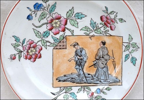 Assiette à dessert décor Japon de la manufacture de faïence de Lunéville par la famille Keller & Guérin vers 1920/30. Décor par transfert rehaussé de couleur. Bel état d'usage. Diamètre 19,2 cm.