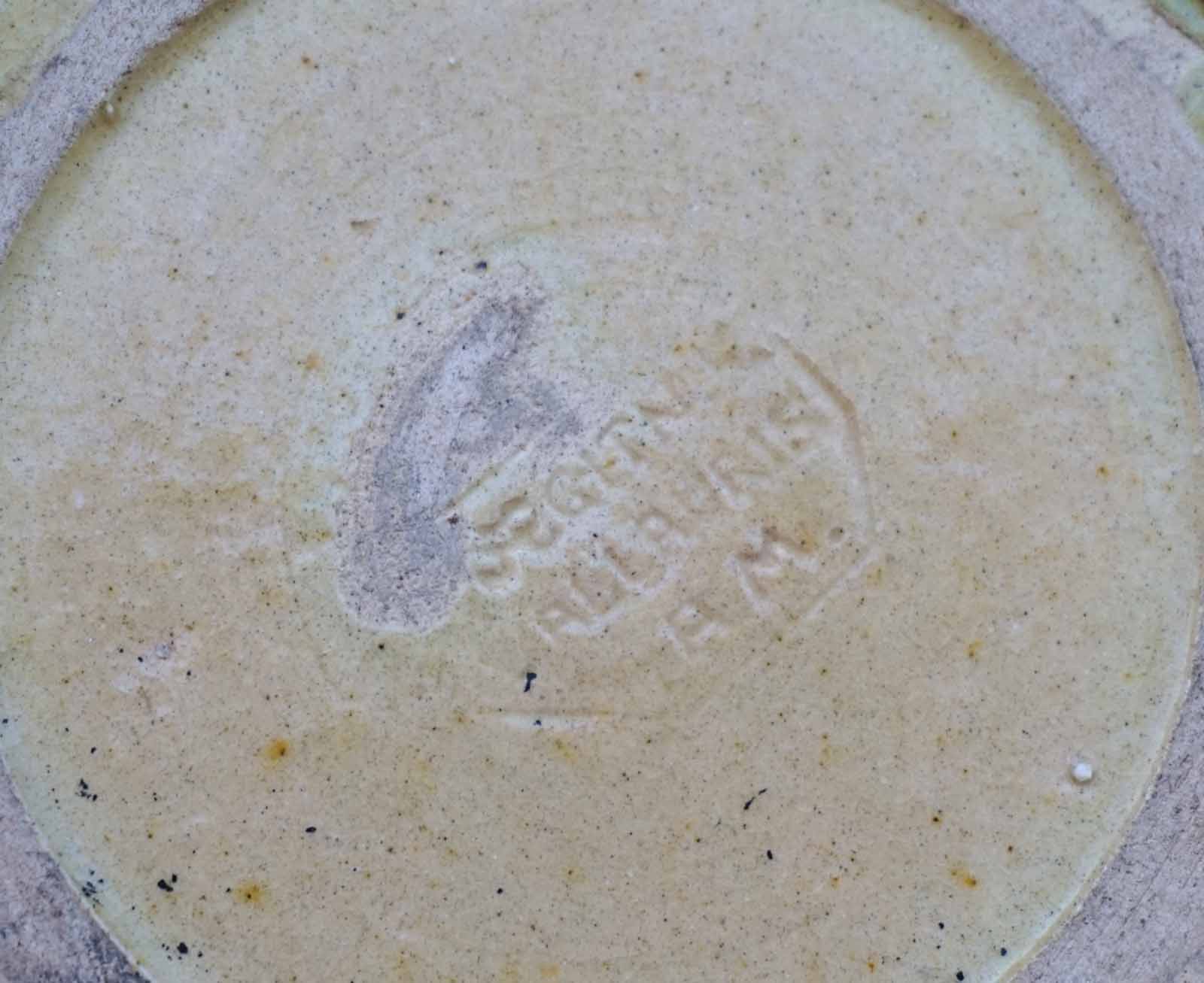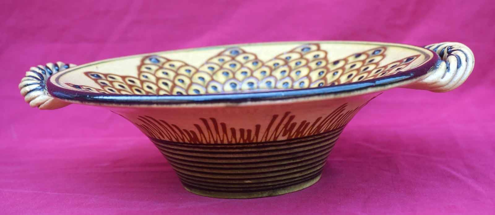 Plat corbeil en céramique décoré main par Aegitna Vallauris vers 1930. Signé sur son fond. Largeur 27.4 cm, hauteur 7 cm. Très bel état, un petit manque de glacure sur le bord.